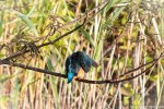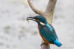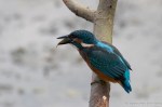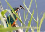 Al vroeg op pad, zodat we om 7 uur ‘s-ochtends al ter plaatse waren en na snel een kopje koffie op de parkeerplaats zochten we de Vogelhut op. Bij de 1e was al snel duidelijk dat we daar niets zouden zien, omdat er heel weinig water stond en het uitzicht behoorlijk belemmerd werd door het riet. Maar bij de 2e hut aan de andere kant van de weg was het gelijk raak ! De IJsvogel zat ons al op te wachten en hoewel hij zich af en toe probeerde te verstoppen achter zijn vleugel, konden wij ons geluk niet op en knipten onze camera’s er lustig op los. In eerste instantie zaten de IJsvogels – ja het waren er 2 – op gepaste afstand, waardoor focussen erg lastig bleek, maar gelukkig had een van de vogels dat door en kwam keurig poseren op een paar meter voor ons. En ook liet hij zijn viskunsten even zien, waarna hij de gevangen visjes verorberde. Wat een geluk ! De eerste keer vogels spotten en dan op zo’n “show” getrakteerd worden ….. 🙂 Na zo’n kleine 2 uur voor ons geposeerd te hebben, vond ‘ie het wel genoeg en vloog na de maaltijd naar een andere bestemming ….