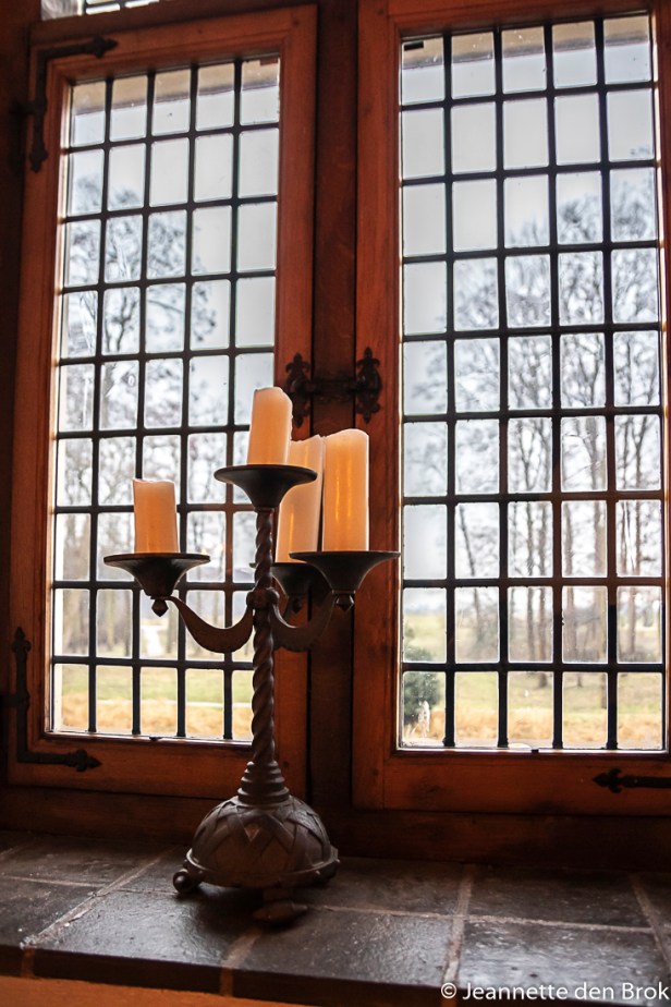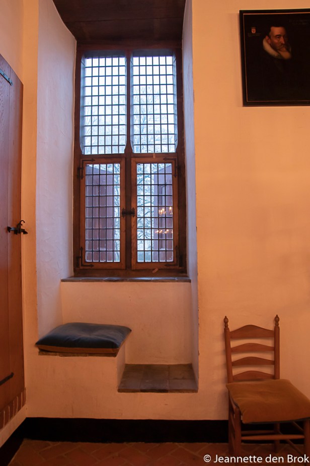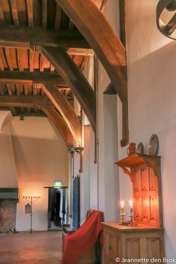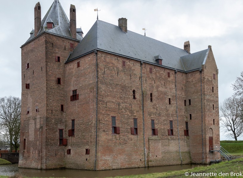 In februari bezocht ik een paar van de oude kastelen die er nog zijn in Nederland. Als eerste op 6 februari kasteel Doorwerth, de mooiste waterburcht van Nederland gelegen in de uiterwaarden van de Nederrijn. Het oudste deel hiervan was een woontoren van 10 bij 15 meter, welke rond 1260 werd gebouwd en waar de “heer” (Berend of Hendric van Dorenweerd) samen met vrouw, kinderen en bedienden de dagen en nachten doorbrachten in één gezamenlijke woonruimte. In de eeuwen erna – 14e, 15e en 16e eeuw – werd het kasteel steeds verder uitgebreid met een zuidelijke vleugel, een grote woontoren aan de noordkant en de bouw van een zuidwest toren. De hoofdingang werd verplaatst en er werd een voorburcht aangebouwd. Zoals wel vaker gebeurde in de geschiedenis werd het kasteel niet altijd bewoond en was het in tussenliggende perioden onderhevig aan verval. Ook dit kasteel is meerdere keren gerestaureerd, de laatste keer na de 2e Wereldoorlog waarin het kasteel zwaar beschadigd raakte. Het kasteel is nu eigendom van de Stichting Vrienden der Geldersche Kasteelen en ingericht als museum waarin ook steeds tijdelijke tentoonstellingen te zien zijn. Op zich best leuk, maar ik zelf vind het leuker als ruimtes zijn ingericht zoals ze dat waren ten tijde van de bewoning door de geschiedenis heen. Vaak zijn dat echter maar een beperkt aantal ruimtes. Zo ben ik eigenlijk best nieuwsgierig naar hoe in de 13e eeuw de heer en zijn gezin (9 kinderen) met hun bedienden in die ene ruimte leefden, eten, speelden en sliepen. Helaas is dat absoluut nergens uit op te maken. De grote woonruimte is op een enkele kast – die duidelijk uit een later tijdstip dateert – een kachel, een harnas en wat vrij moderne stoelen na leeg. De keuken en woonruimte in een van de later aangebouwde delen zijn gelukkig wel ingericht en ook is er in een van de “nieuwere” torens een ruimte ingericht als kapel/vergaderruimte. Wat ik altijd de leukste plekjes vind in oude kastelen zijn de raam-nissen, waarin de dames – bij het licht – zaten te borduren of wat voor bezigheden dan ook ….