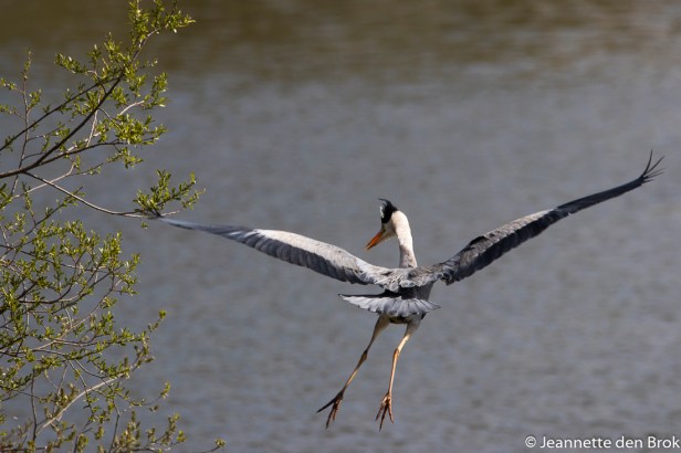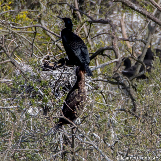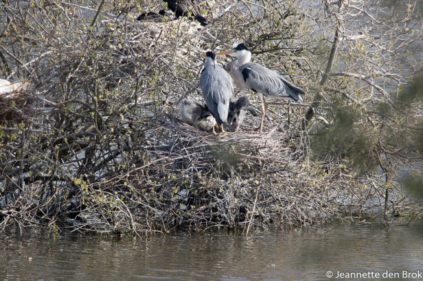 3 dagen na de boottocht op de Biesbosch, waarbij ik al wat watervogels had gefotografeerd, bezocht ik weer een plek waar normaal gesproken ook watervogels te zien zijn en waar ik graag de Aalscholvers en Lepelaars wilde vastleggen. En gelukkig waren deze volop aanwezig. De Aalscholvers hadden al jonkies die inmiddels alweer aardig groot begonnen te worden. Bij de Lepelaars kon ik nog geen jong grut ontdekken, dus over een paar weken nog maar eens die kant op om te kijken. Wel zaten er volop Blauwe Reigers met hun nesten verscholen tussen de takken en daar waren wel duidelijk jongen aanwezig die met regelmaat door hun ouders werden gevoerd. Mooi om te zien dat zodra de ene aankomt met eten voor de kroost, de andere ouder gelijk vertrekt voor de volgende ronde. Echt wel leuk om de jonge Aalscholver en Reiger-gezinnen zo te zien. Ondanks dat het wel heel erg koud was in de hut, waar de gure noordoostenwind vol op stond, toch weer een hele ochtend vogels geobserveerd, want behalve de watervogels kwam er af en toe ook nog wat anders voorbij ….