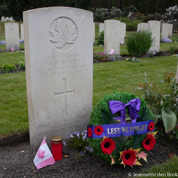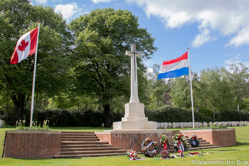 De ceremonie die hier plaatsvond was ook erg mooi. Er waren veel mensen aanwezig; de Consul van Canada, (oud) militairen en mariniers, zowel Nederlands als Canadees en ook waren nabestaanden uit Canada aanwezig. In de toespraken van de voorzitter en oud-voorzitter van het Comité 4 mei en de burgemeester van Rijssen-Holten werd uitgebreid stilgestaan bij de oorlog, maar ook hoe het nu in de wereld gesteld is met acceptatie – of juist niet – van mensen die “anders” zijn en met name de kinderen werd gevraagd te zorgen voor een betere wereld in de toekomst. Er was muziek door het plaatselijke harmonie-orkest en een Pipes and Drums band. Door kinderen werden gedichten en verhalen voorgedragen, zowel in het Nederlands als Engels en Frans en natuurlijk werden er kransen gelegd. Maar naast de kransen werden ook alle bijna 1400 graven voorzien van een boeketje rozen. En omdat er niet genoeg schoolkinderen aanwezig waren om dit te doen, werden mijn zus en ik verzocht hierbij te helpen, een oproep waar we graag gevolg aan gaven, ondertussen ook nog wat andere aanwezige kinderen aansporend (met wisselend succes) ook mee te helpen.