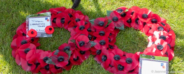 Na de officiële plechtigheden bleven we nog even rondkijken, waarbij ik zag dat de Canadese vlaggendragers zich met een aantal militairen en burgers rondom een van de graven verzamelden en daar gefotografeerd werden. Dit leek me wel een geschikt moment om ook mijn camera uit mijn tas te halen. Tijdens de herdenking maakte ik uit respect geen foto’s, maar nu liep ik ook richting de vlaggendragers om wellicht een fotootje te kunnen maken. Toen ik bij de groep arriveerde zag ik dat zij met een of ander ritueel bezig waren. Er werd whisky gegoten over een grafsteen, waarna de fles whisky rondging onder de aanwezigen en iedereen een slok nam. Nieuwsgierig geworden sprak ik een van de dames (een Canadese) die hierbij betrokken was aan met de vraag wat dit voor ritueel was. Zij vertelde dat de hier begraven militair haar oom was en zij op hem proosten, waarbij het gebruikelijk was dat degene op wie geproost werd de eerste slok kreeg. Inmiddels hadden ook haar man en mijn zus zich bij het gesprek gevoegd en kregen ook wij de fles whisky in onze handen gedrukt en hebben we mee geproost op de oom …. Heel bijzonder om dit mee te mogen maken. We bleven nog een tijdje napraten met deze mensen, over de herdenking en over Canada, waarna we afscheid namen en hun een goede thuisreis wensten.