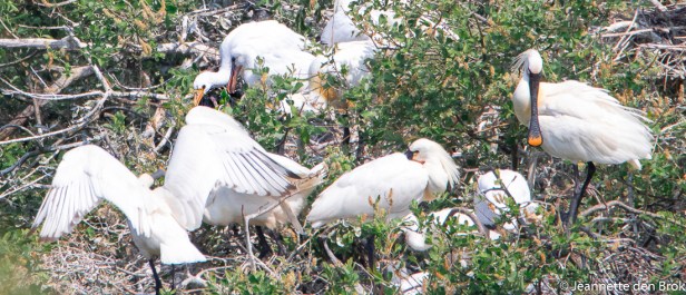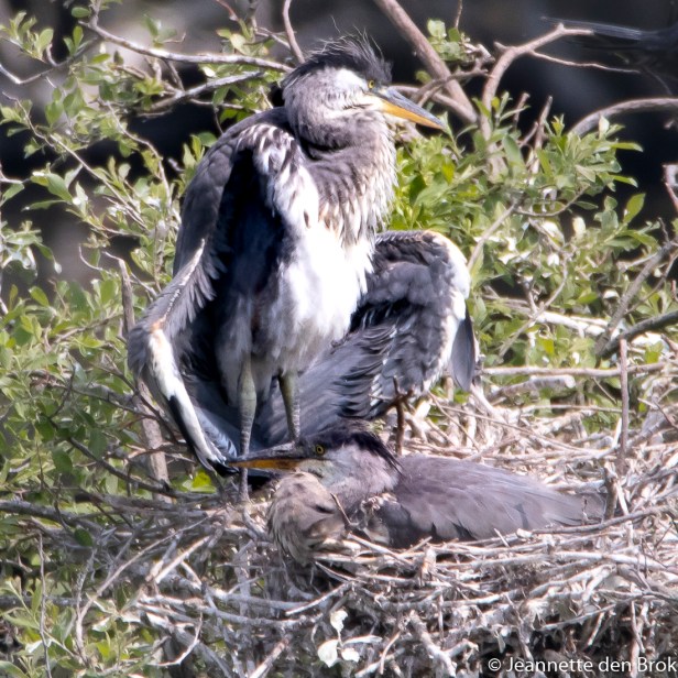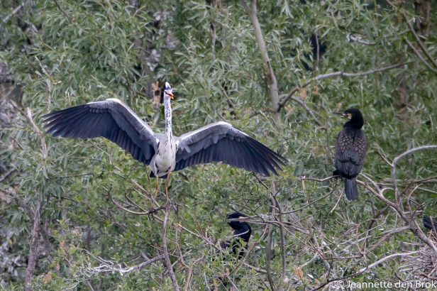 Omdat het fotograferen van bosvogels op de Grebbeberg niet echt een succes was, ben ik daarna maar weer naar de Vogelhut in de Blauwe Kamer gegaan om te kijken of de jonge Reigers en Aalscholvers inmiddels gegroeid waren en er ook jonge Lepelaars bij gekomen waren. En jawel hoor, wat gaat dat snel ….