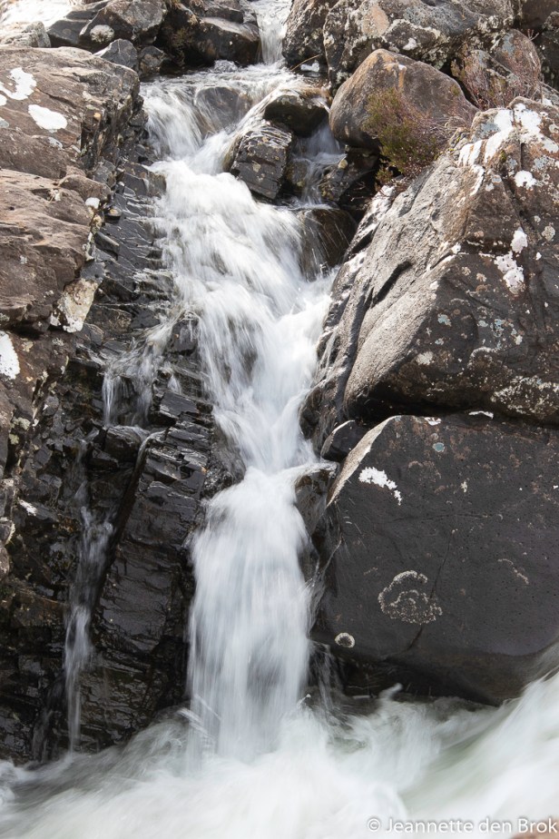 En uiteraard bezochten we – zoals gebruikelijk bij Nordic Vision – gedurende de week diverse locaties, waar je dan steeds weer een geheel ander landschap aantrof en je met hulp van de begeleidend fotograaf de mooiste plaatjes kon maken. Met het busje parkeerden we natuurlijk zo dicht mogelijk bij de foto-locaties, maar soms moest er toch nog wel een stukje gelopen worden en in het ruige landschap van Schotland zijn niet alle paden vlak en geplaveid. Dus heuvel op en heuvel af, over rotsige paden, waterstroompjes oversteken via – nét iets te ver uit elkaar liggende stapstenen – of over gladde natte rotsen klauteren was soms nodig om de mooiste plekjes/standpunten te bereiken. Aan iedereen natuurlijk zelf de keus hoever je daar in gaat (zoals Bløf zingt: “hoe ver je gaat, heeft met afstand niets te maken …..”). Maar als je op weg bent naar de Fairy Pools die al enige jaren op je Bucket List staan, dan stop je niet 20 minuten voor het eindpunt ondanks dat de weg erheen misschien wat zwaarder is dan je verwachtte ….