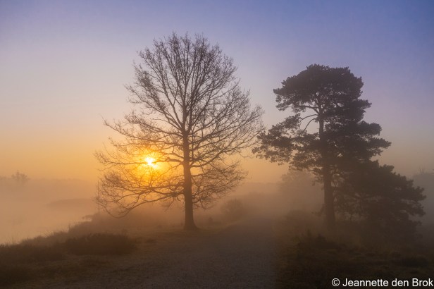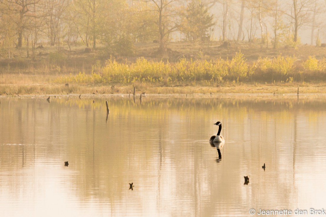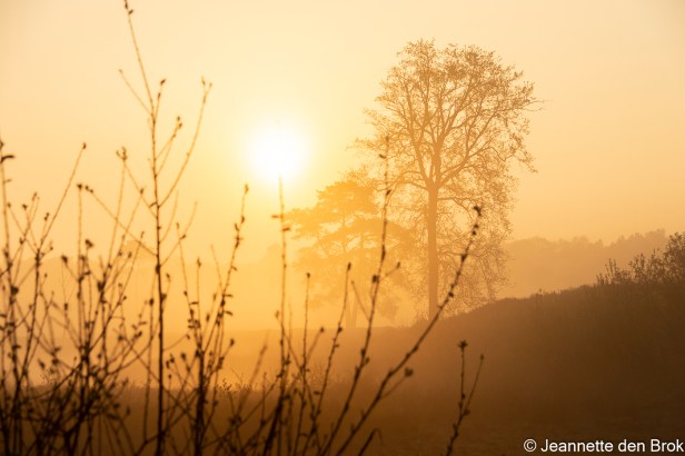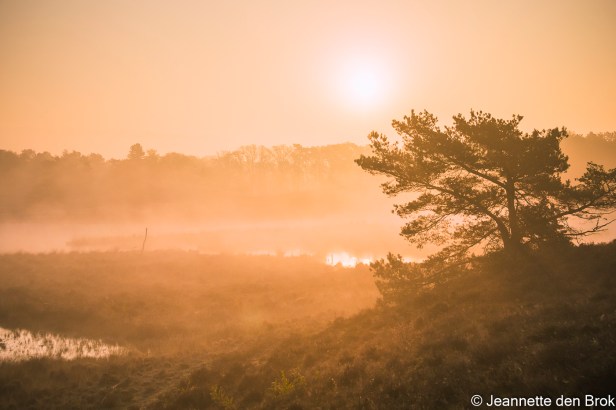 Zaterdag 1 mei, ik werd wakker en wierp een blik op de wekker: 5 uur. Vervolgens een blik naar buiten en nog geen half uur later was ik op weg …. In no time had ik mijn fotorugzak gepakt, een thermosfles koffie en een boterham in mijn tas en zat in de auto onderweg naar de Hatertse Vennen. Daar was ik getuige van een prachtige zonsopkomst in de mist. Watervogels waren er helaas niet in grote getale aanwezig, zoals de vorige keer dat ik er was, dus geen opvliegende ganzen tegen een mooi gekleurde lucht, maar een prachtige – bijna mysterieuze – sfeer over het water en het landschap. Zo mooi dat je bijna niet hoeft te zoeken naar het beste plekje, want het is overal mooi. Alleen wel goed blijven kijken natuurlijk, want doordat ik alleen maar oog had voor de schoonheid van de zonsopkomst boven het water en landschap, had ik niet gezien dat er een stukje verder, rechts voor mij nog een andere fotograaf stond. Op mijn eerste foto’s dus een statief in beeld …. Dat is natuurlijk wel redelijk makkelijk weg te poetsen, maar toch zelf maar iets verplaatst en opnieuw aan de slag. Niet zo’n probleem want ik had voldoende tijd, door de mist duurde het “gouden uurtje” ook echt bijna een uur. Toen het licht al wat harder werd, mijn Macro lens nog even op de camera gezet om daar nog wat mee te spelen, tot mijn maag zich meldde en ik even terug ging naar mijn auto om te ontbijten. Intussen wat het tegen 8 uur en had ik eigenlijk nog geen zin om dit mooie gebied te verlaten, dus mijn rugzak wat lichter gemaakt, statief in de auto gelaten en nog een flinke wandeling gemaakt. Ook tijdens de wandeling nog wat gefotografeerd, vooral geprobeerd wat watervogels in het laatste restje mist vast te leggen, maar daarvoor was mijn 200 mm niet voldoende en de zware telezoomlens had ik natuurlijk niet bij op mijn wandeling. Een volgende keer dat ik dit gebied bezoek misschien maar een krukje mee en eens een uurtje of wat aan de waterkant gaan zitten met de telezoomlens. Kijken wat dat oplevert. Maar voor nu kan ik alleen maar zeggen, het was een mooie ochtend !
