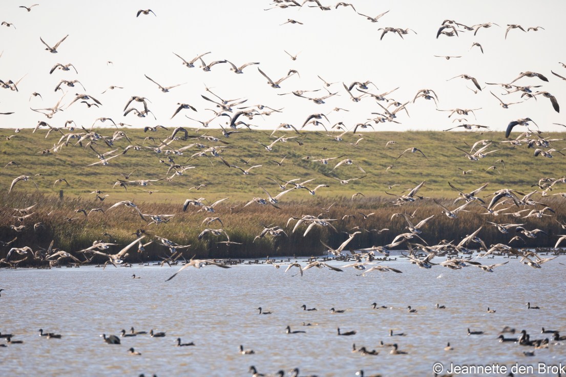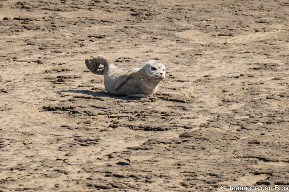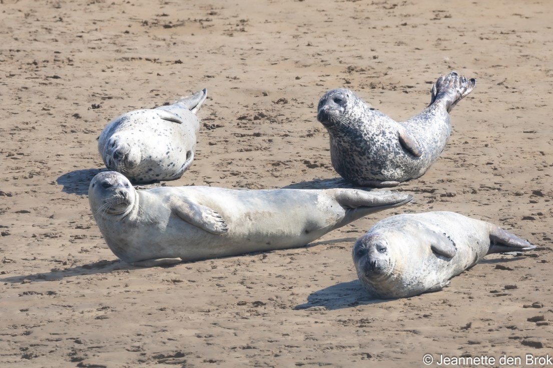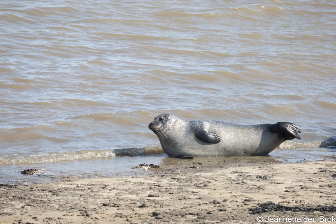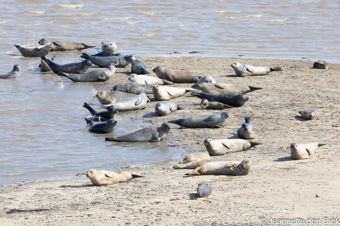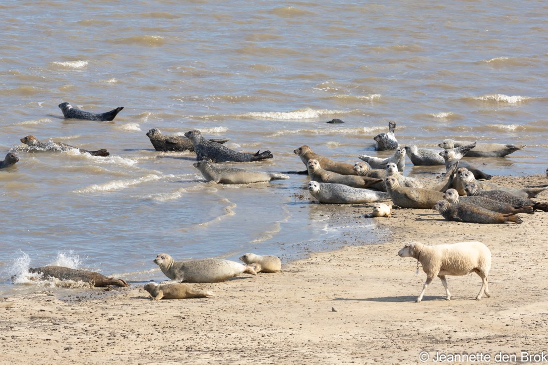 En met het opkomen van de vloed komen de Zeehonden steeds dichterbij. Het is dan ook prachtig weer en ze liggen dan blijkbaar liever op het warme zand dan in het water. Uiteindelijk blijft er slechts een klein stukje strand over, maar daar tellen we dan wel zo’n 50 Zeehonden op. Wat een mooi gezicht. En dan zeker als er af en toe een groepje Schapen langskomt ….. Grappig om de interactie tussen deze dieren te zien. De langslopende Schapen worden door de Zeehonden nauwlettend in de gaten gehouden en als ze té dichtbij komen, waggelen (hoe moet je het anders noemen) de Zeehonden massaal het water weer in.