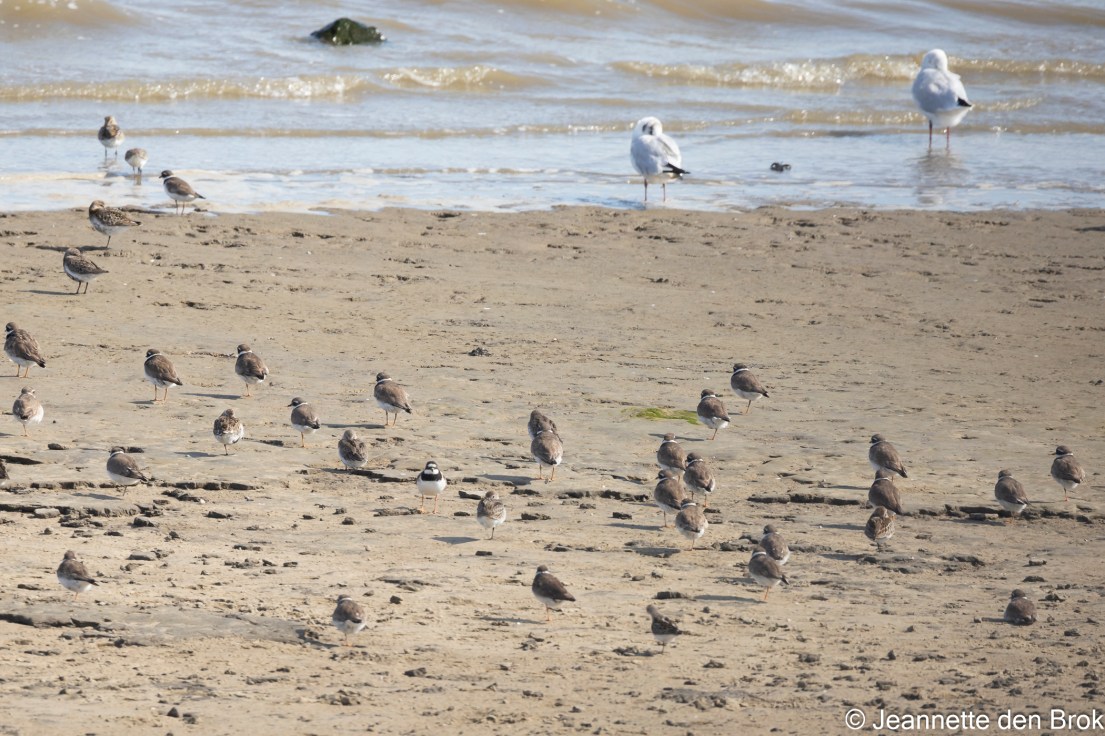 Als vervolgens de plas zo’n beetje leeg is, pakken we onze fotospullen weer in en gaan naar de Zeehondenkijkwand die we vanuit de hut al zagen. Deze wordt hier jaarlijks in het voorjaar hier opgebouwd en blijft dan tot zo’n beetje half September staan. Het is als we aankomen nog laagwater, maar het uitzicht is geweldig mooi. Vrij vooraan een hele groep Strandlopers, zowel Kleine als Bontbekplevieren herkennen we hierin. En in de verte zien we al de eerste Zeehonden liggen.