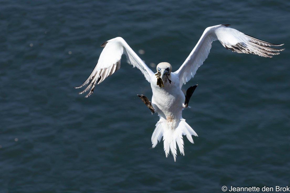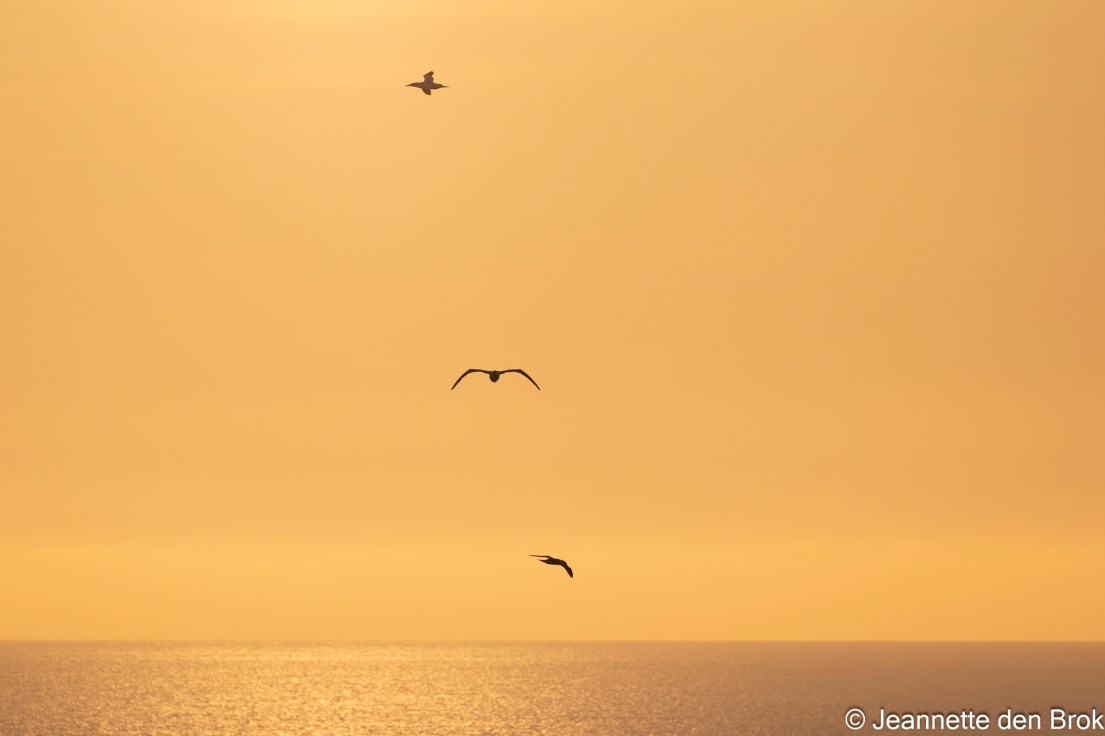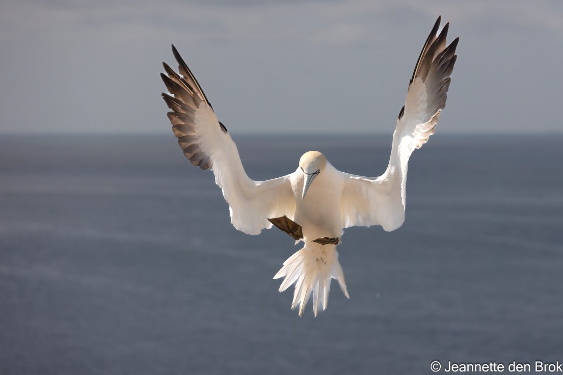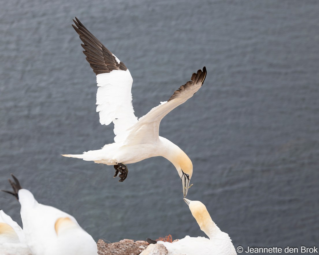 Zondag na het ontbijt moeten de koffers/tassen al ingeleverd worden, zodat deze naar de Veerhaven gebracht kunnen worden. Daarna gaan we een laatste keer met zijn allen weer de berg op naar de Jan van Genten, waar we tot tegen de middag fotograferen. Vandaag lukt het me om de allerjongste telgen vast te leggen en zijn we ook getuige van enkele fikse “ruzies” tussen de vogels. Maar mijn grootste uitdaging is om de aanvliegende vogels in hun specifieke houding net voor de landing goed vast te leggen. Ik had dit al enkele keren geprobeerd de afgelopen dagen, maar was nog niet echt tevreden. Nu had ik daar iets meer geluk mee en kon ik uiteindelijk met een zeer tevreden gevoel voor de laatste keer de berg weer afdalen.