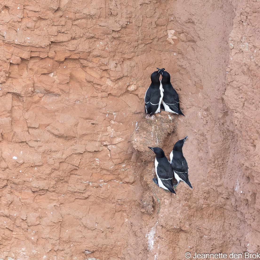 De volgende ochtend staat om 8 uur het ontbijt voor ons klaar en na dit ontbijt, gaan we weer richting de de Jan van Genten. Vanaf ons hotel was dit een kleine 1,5 km. lopen, maar wel een beetje omhoog “de berg op”. Met zware rugzakken kostte dit ons over het algemeen zo’n 20 minuten. Vandaag ging het werken met mijn nieuwe camera me al iets beter af en ik kreeg er dan ook steeds meer plezier in. Ook begonnen we al – met name de begroetings – patronen te herkennen van de vogels en herkenden we de wat jongere vogels aan hun donkerdere vleugels, die met de jaren steeds witter worden. En we ontdekten dat er niet alleen Zeekoeten tegen de rotswanden zaten, maar ook wat Alken, herkenbaar aan de witte strepen de snavel.