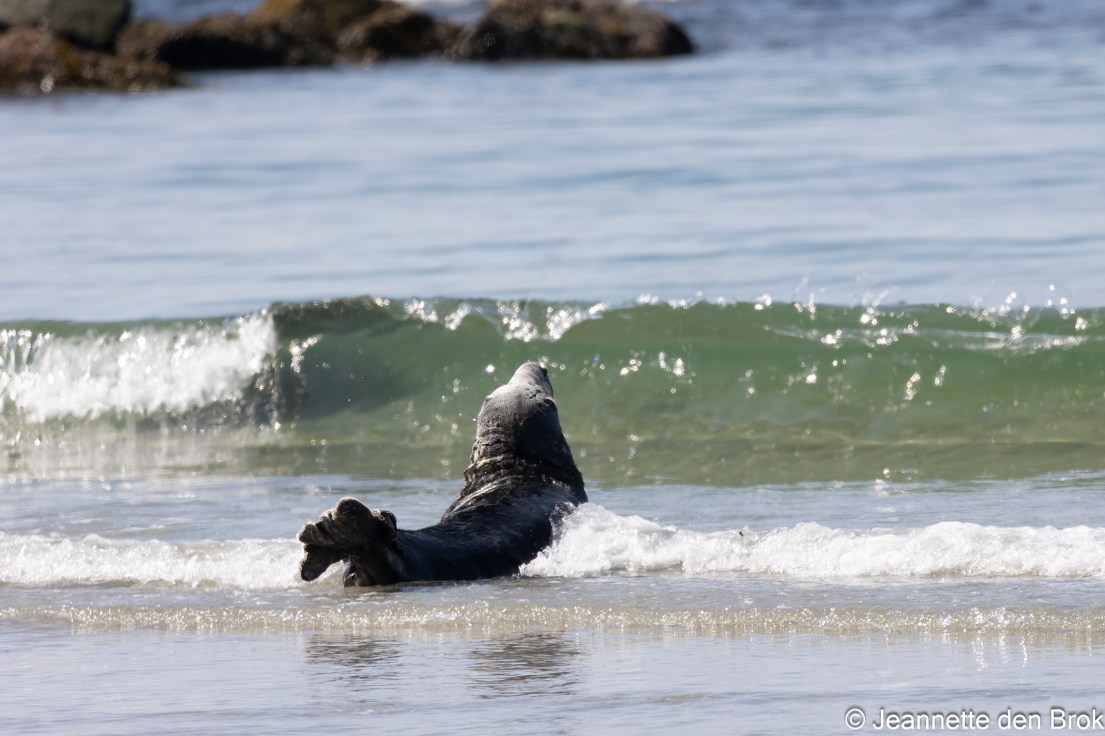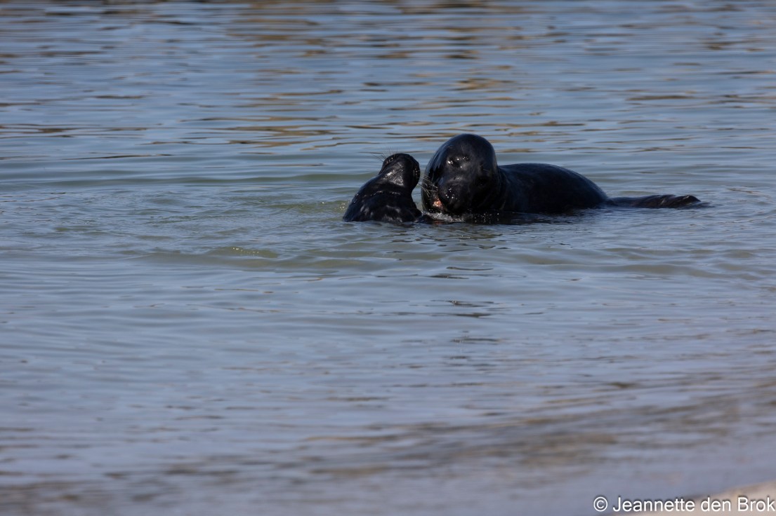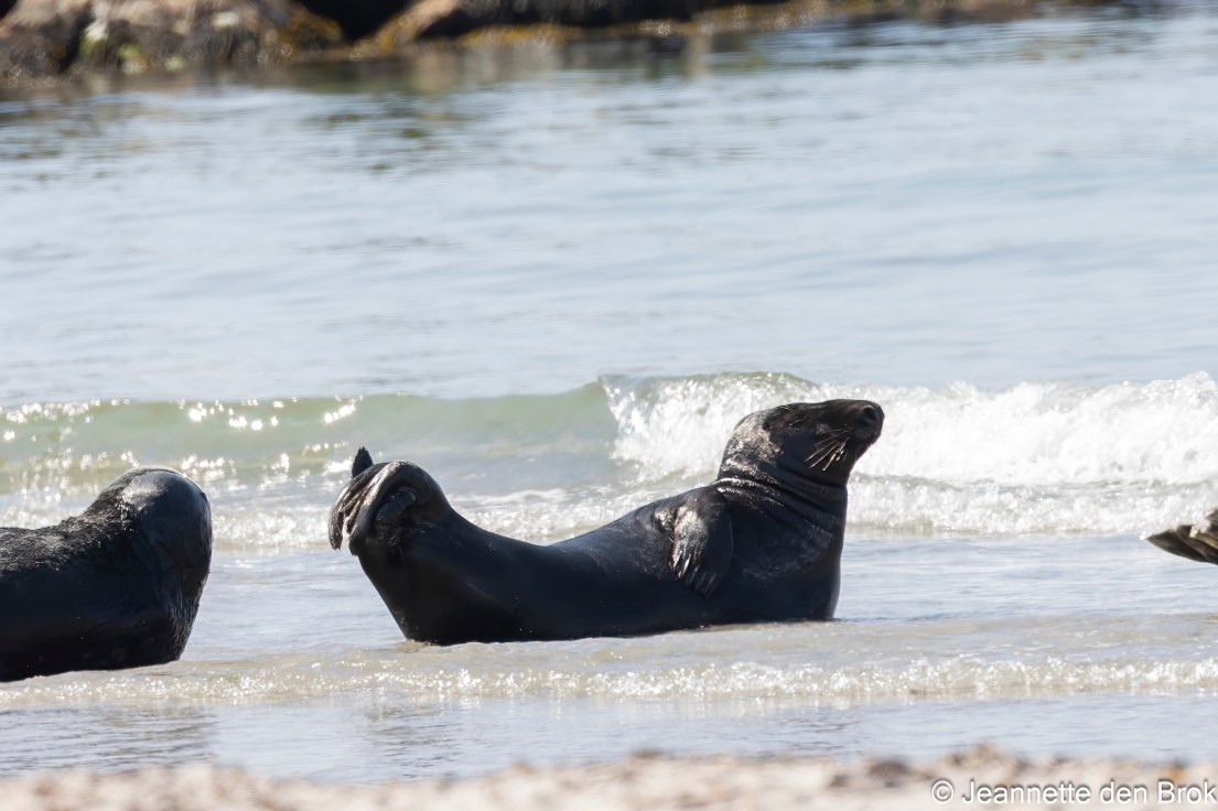 Na dit ontbijt pakken we de fototassen weer op, om naar het haventje te gaan, vanwaar we om half 10 een bootje nemen naar het eilandje Dune. De overtocht duurt maar 10 minuutjes, maar met een overvol geladen boot is dat ook meer dan genoeg …. Op Dune willen we de Zeehonden gaan fotograferen die hier heerlijk lui op het strand liggen. Eerste foto’s worden echter gemaakt van de Eidereenden, die we al gelijk aantreffen als we het eiland op lopen. Wat een bijzonder mooie eend is dat zeg ! Tenminste het mannetje, de vrouwtjes (een hele harem, zo lijkt het) zijn wat saaier van kleur. Dan door naar de Zeehonden; de eerste 2 die we spotten zijn vrij vooraan op het eiland wat aan het spelen in het water. Maar voor de rest van de Zeehonden moeten we naar de andere kant van het eiland lopen over het warme zand. Het is gewoonweg strandweer vandaag, vandaar de volle boot ! En tja, met zo’n weer doet een Zeehond over het algemeen niets …. alleen maar lui op het strand en een beetje in het water liggen ….