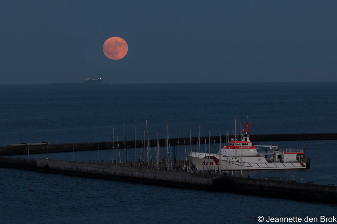 Rond 9 uur ben ik boven en probeer ik nog wat Jan van Genten tegen een ondergaande zon te fotograferen, maar dat valt niet mee. Tenminste zoals ik het voor ogen had komt er niet helemaal uit. Maar ja, een beetje oefenen en dan volgende keer beter ! Een goed uur later weer terug om onderweg nog verrast te worden door een volle maan boven de zee, die pikken we dan toch nog even mee.
