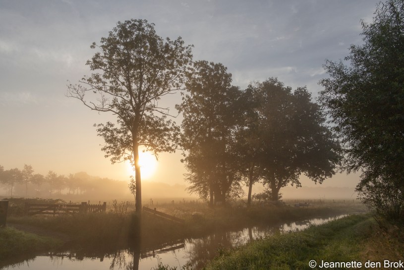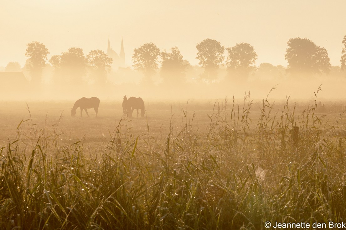 Vandaag heb ik vrij, maar heb toch de wekker gezet omdat ik me voorgenomen heb op zoek te gaan naar Libellen en een poging te ondernemen om deze ‘s-morgens vroeg, als er nog dauwdruppels op zitten, te fotograferen. Dus stap ik om kwart voor 6 uit bed om zo’n 3 kwartier later op mijn bestemming te zijn, een struingebied langs de beek “de Leygraaf” in Uden, waar verschillende Libellen soorten voor zouden komen. Het is een mooie ochtend, er hangt wat nevel boven de velden en de zon doet zijn best hier doorheen te komen. Onder de bomen aan de andere kant van de beek ontwaar ik een groep schapen en een eind verder staan een aantal paarden in de wei met in de verte op de achtergrond de onmiskenbare dubbele torens van de Petruskerk in Uden. Ik wissel dus al snel mijn 105 mm Macro-lens (die ik op de camera had voor de Libellen) om voor de 24/240 welke beter geschikt is om te proberen deze mooie ochtend vast te leggen.