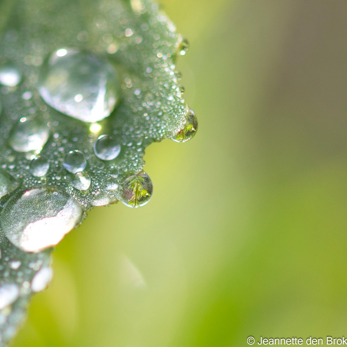 Het duurt echter niet lang voor de zon het wint van de nevel en het klaart dan ook snel op. Terwijl ik verder loop langs de Beek, zie ik dat de groep schapen aan de overkant mij met nieuwsgierige blikken volgt. Ja, met de Beek ertussen durven ze wel 😉 . Het gras waar ik doorheen struin is hoog en nog erg nat van de regen afgelopen nacht, dus af en toe wijk ik even uit naar het naastgelegen fietspad wat tussen de wilgen doorloopt. Aan de andere kant van het fietspad zie ik ook een struinpad langs het weiland en in dat weiland bloeit Rode Klaver. Dus tijd om de Macro lens weer op de camera te schroeven. Libellen heb ik nog niet gezien, maar bloemen zijn ook altijd leuk, zeker als er nog dauwdruppels op zitten. Of regendruppels …. zoals die nog op sommige bladeren zitten. Ook erg mooi, zeker als je nog een weerspiegeling ziet in die druppels !