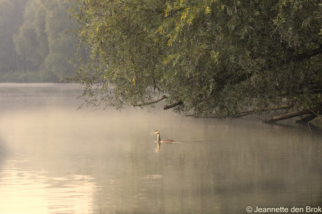 Zaterdag 30 september stapte ik – voor de zoveelste, maar zeker ook niet de laatste keer – weer in de JBN Sloep van Judith Borremans voor een vaartocht door de Biesbosch. Je kan natuurlijk ook zelf een sloep huren om door de Biesbosch te varen, maar dan kan je pas na 9 uur vertrekken waardoor je de mooiste en rustigste uren op het water mist en bovendien moet je dan uiteraard zelf het bootje besturen, waardoor het fotograferen ook iets lastiger wordt. Dus kiezen mijn zus en ik nog steeds voor deze tochten, die altijd goed verzorgd zijn/worden en waarvan we altijd wel blij en tevreden thuis komen. Vooral van de vroege uurtjes op het water – die soms behoorlijk koud kunnen zijn – genieten we altijd met volle teugen. Zo ook vandaag weer. Zodra we de Amer overgestoken waren en in de Aakvlaai aankwamen, kwamen de camera’s tevoorschijn en zagen we de eerste watervogels in het dunne laagje mist wat over het water hing opdoemen.