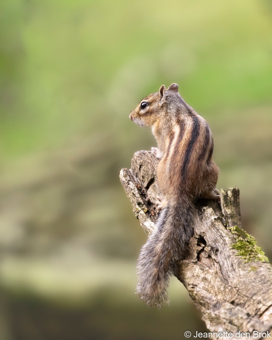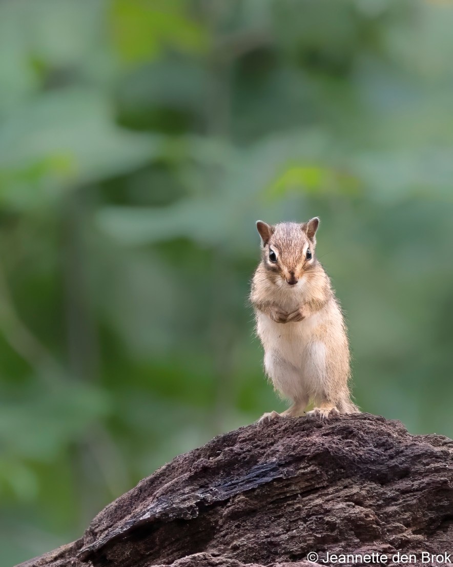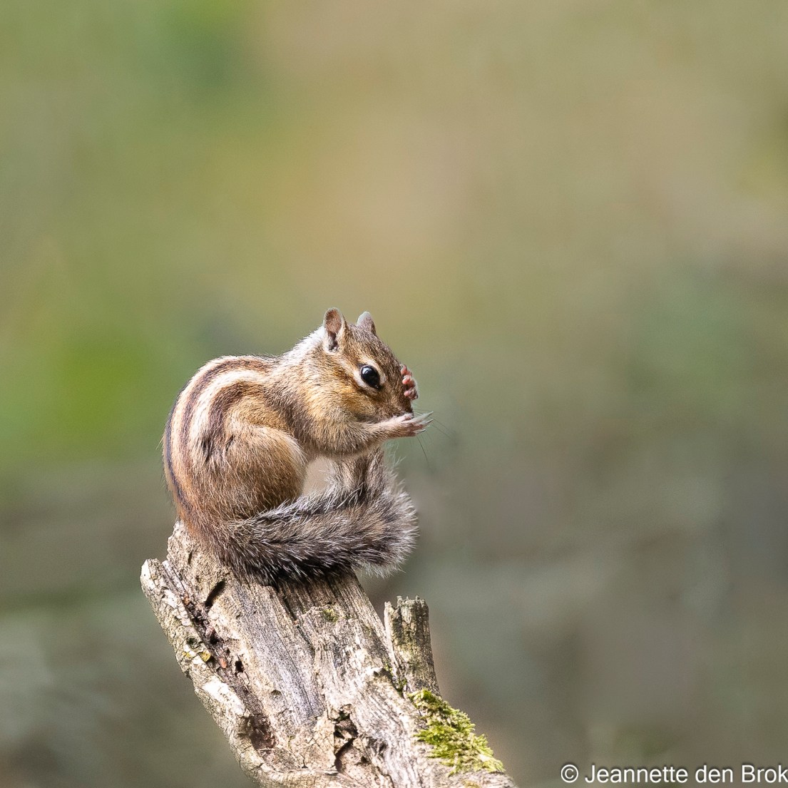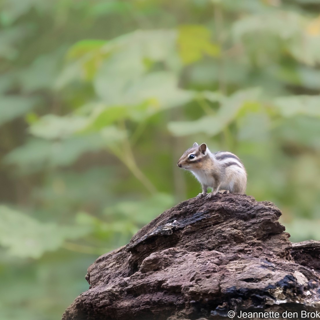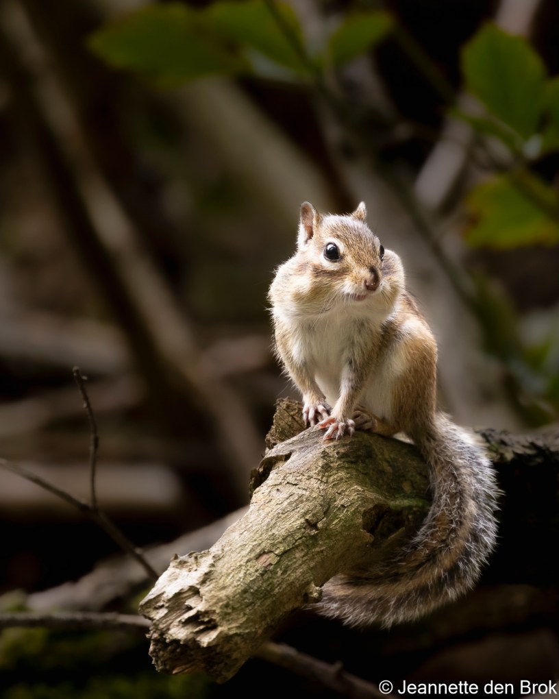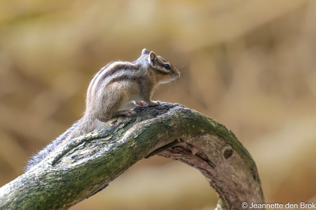 Járen geleden zag ik voor het eerst een foto van ze. Vanaf dat moment wilde ik ze in levenden lijve zien. Waar ik ze kon vinden had ik al eens aan een andere fotograaf gevraagd en stond dus ook al jaren op een Post-it memootje wat ik ergens in een lade had opgeborgen. Toen ik afgelopen Zaterdag weer een workshop had in de Biesbosch, kwamen ze toevallig ter sprake. Ook nu kreeg ik weer uitleg waar ik precies moest zijn om ze te zien en dus werd het echt tijd om ze een keer te bezoeken. Twee dagen later, op maandagochtend – ik dacht dan is het vast niet zo druk in het bos – stapte ik in de auto richting de Oude Warande in Tilburg. Op deze plek was vroeger een dierenpark, maar dit werd in 1973 gesloten en alle dieren werden verhuisd. Behalve …. Of ze over het hoofd gezien werden, of dat ze ontsnapten uit een kist is niet geheel duidelijk, maar in elk geval verhuisden ze niet mee en bleven in Tilburg. Daar voelen ze zich blijkbaar prima thuis en redden ze zichzelf prima. Het aantal breidde zich over de jaren uit, soms waren er zoveel dat het door de bewoners in de omgeving als een ware plaag werd gezien; volgens een buurtbewoner die ik er sprak zaten ze overal in de tuinen en zelfs in huis, maar nu valt het weer mee. Geschat wordt dat er nu zo’n 150 in de Oude Warande rondscharrelen. Dus op zoek maar …. Helaas (?) was het prachtig weer deze ochtend, waardoor het best druk was in het bos en vooral veel mensen deze ochtend hadden uitgekozen om hun hond(en) hier uit te laten. En van honden blijken deze exotische diertjes bang te zijn – volgens dezelfde buurtbewoner die ik sprak en ook zijn hond bij had. Maar op een gegeven moment zag ik toch wat beweging tussen de bladeren op de grond. En jawel hoor, er kroop iets een tak op en daar was mijn eerste ontmoeting met de Siberische grondeekhoorn !