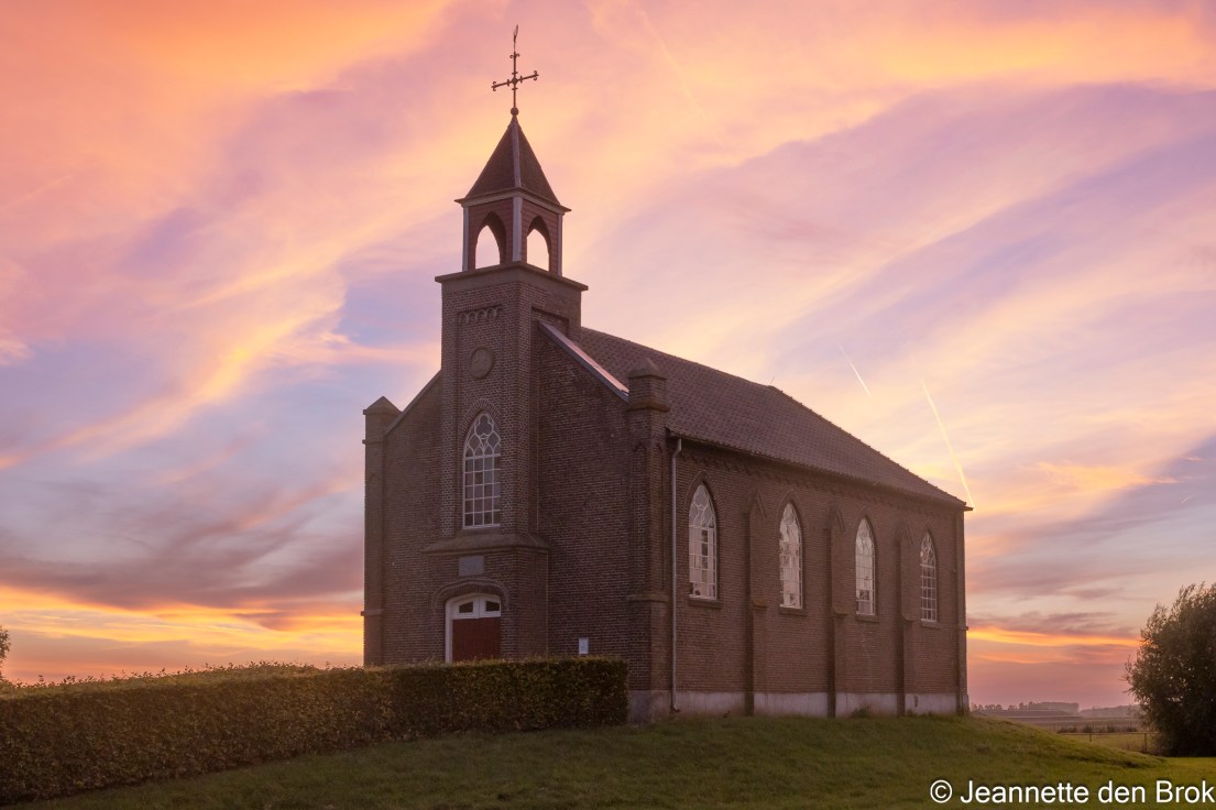 Hier een uur rond blijven hangen tot na zonsondergang ging me toch iets te ver, maar aangezien de lucht zo mooi kleurde wilde ik toch hiervan gebruik maken om nog op een andere plek te proberen wat moois te maken tijdens en na zonsondergang. Dus snel weer ik de auto en Google Maps ingesteld op de Vluchtheuvelkerk in Homoet. Dat zou zo’n 40 minuten rijden zijn, waardoor ik net rond het tijdstip van de zonsondergang zou aankomen. En dat lukte …. En wat nog meer lukte ….