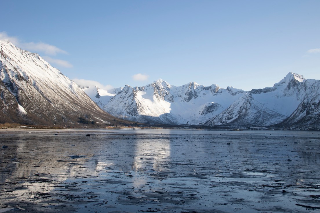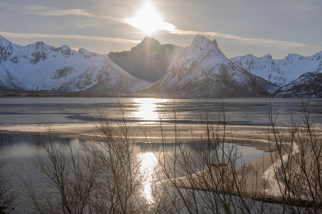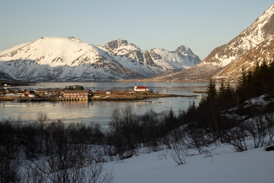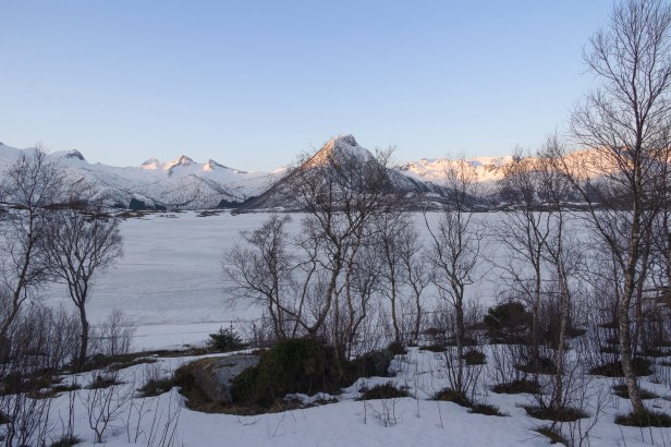 Op de terugweg maakten we nog enkele stops, o.a. bij het uitzichtpunt op de Austnesfjord waar je een heel mooi uitzicht hebt op het Sildpollnes kerkje. Om daar te komen reden we iets te ver door op een smal bergweggetje, waardoor we op privé terrein kwamen en door een van de bewoners resoluut weer weggestuurd werden. We mochten er zelfs niet keren, maar moesten achteruit het weggetje weer af. Maar we keerden toch snel om en vonden een stukje terug wel een parkeerplaats zodat we het kerkje en de omgeving toch nog konden bewonderen en vastleggen. De laatste stop die dag was dichtbij de camping, aan het bevroren meer, waar we genoten van een mooie zonsondergang.