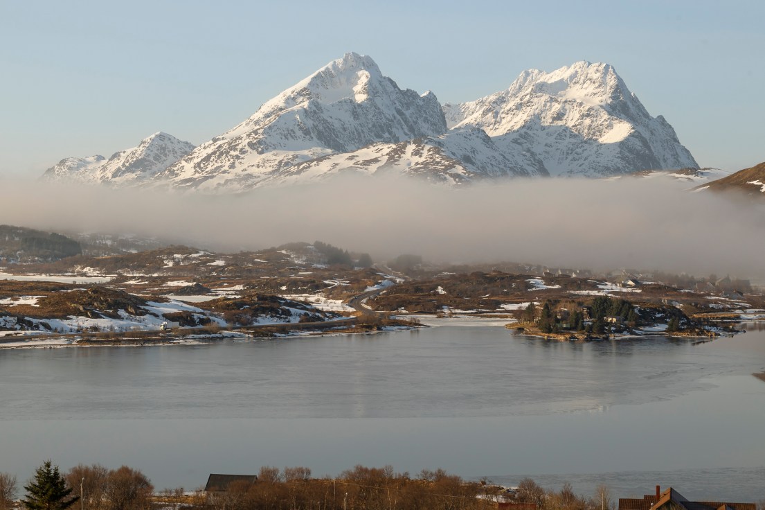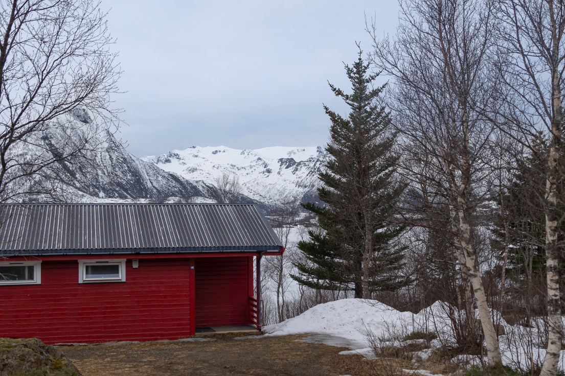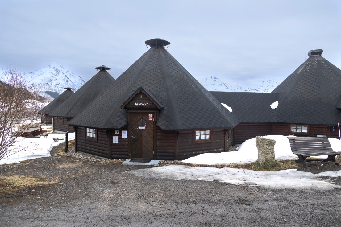 De reis naar de Lofoten kost een hele dag; vanaf Schiphol naar Oslo, daar een paar uur wachten op het vliegtuig naar Bodo en vanaf daar in een wat kleiner vliegtuig naar Svolvaer. Bagage ophalen en dan kunnen we het busje in om naar Sandsletta Camping – ons verblijfadres – te rijden. Maar oeps, er misten 2 koffers van ons gezelschap. Deze waren blijkbaar achtergebleven op Bodo en zouden uiteindelijk de volgende dag alsnog aankomen, maar hierdoor duurde het wel iets langer op het vliegveld. Daardoor kwamen we wat later op de Camping dan gepland en omdat het eten al klaarstond, was het even snel bagage droppen in je toegewezen blokhut en dan gelijk aan tafel in het hoofdgebouw. Geen tijd om iets uit de bagage te halen en dat was jammer, want hoewel er geen 30 cm verse sneeuw lag – waar ik toch stiekem eigenlijk wel op gehoopt had – lag er op de paden nog wel sneeuw, die overdag dooide en ‘s-avonds als het afkoelde weer opvroor zodat het spekglad werd. Dus na het eten op de terugweg in het donker – zonder snowgrips en zaklamp dus – ging ik al flink onderuit. Gelukkig bleef mijn kwetsuur beperkt tot een flinke blauwe plek.