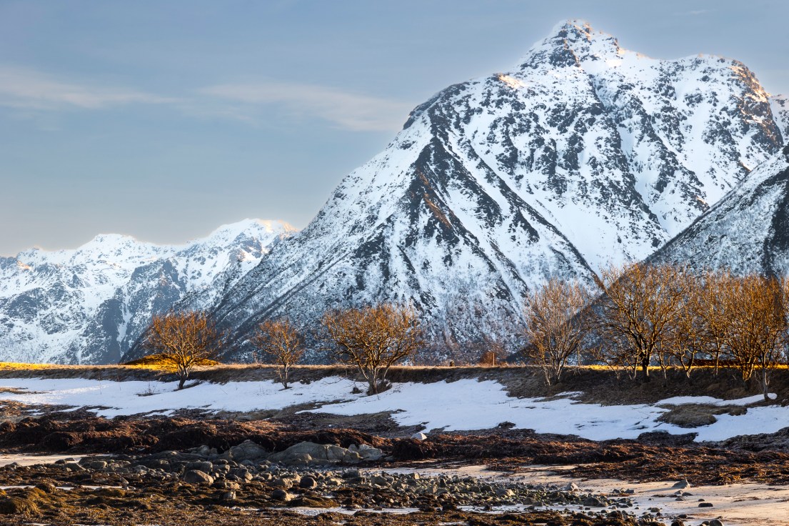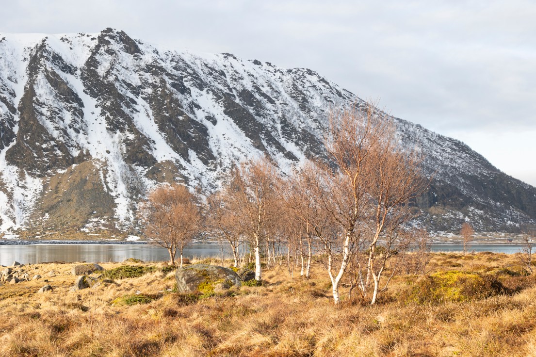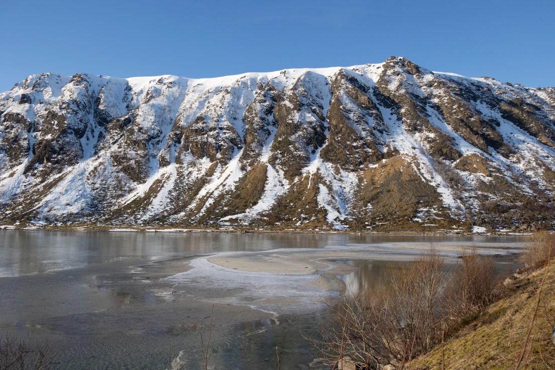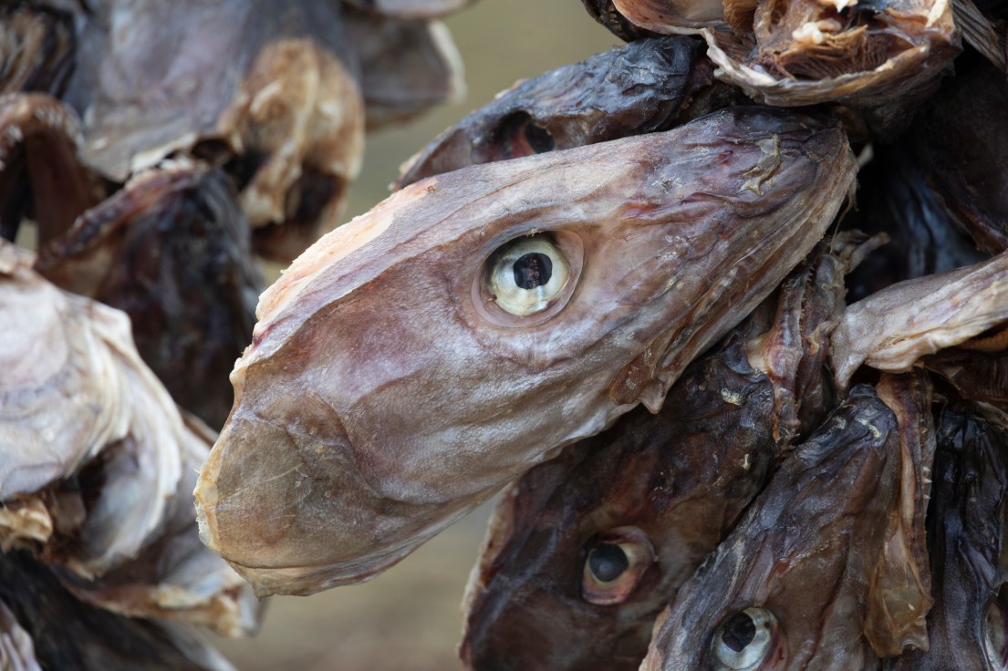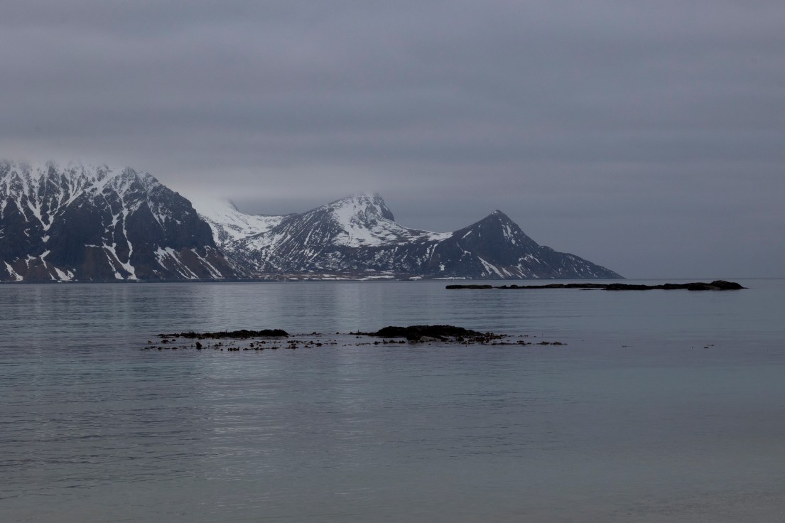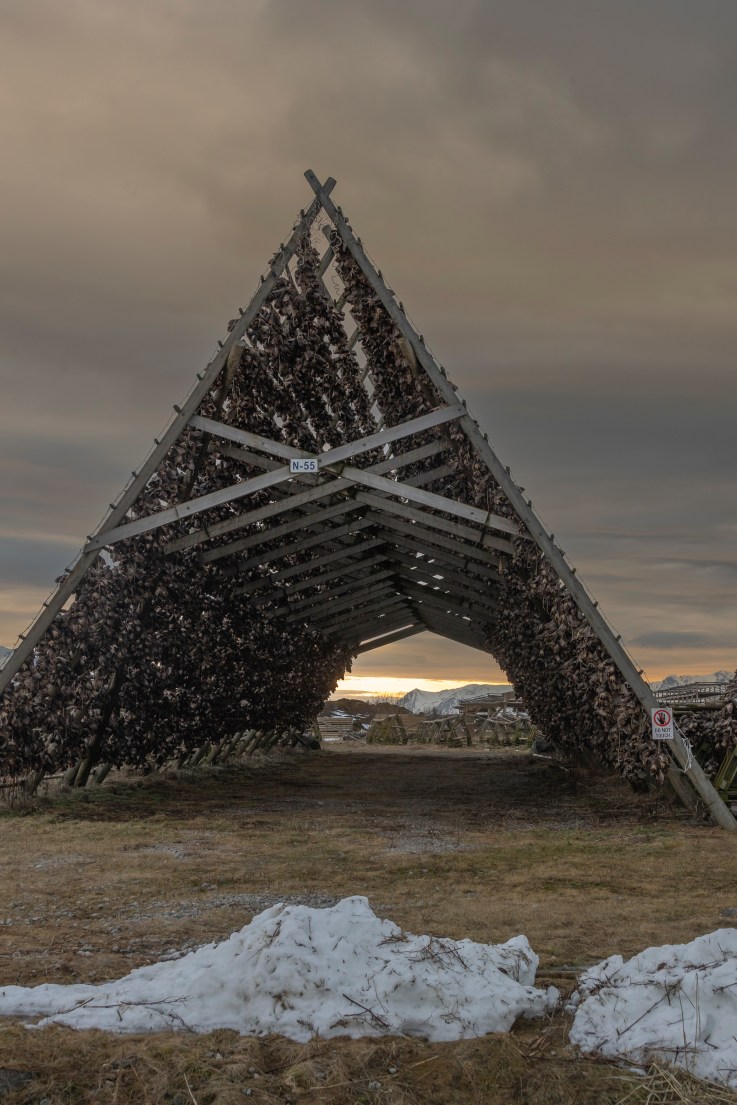 Ons eerste foto-object was niet echt mijn favoriete onderwerp. We gingen naar de Stokvis-rekken, waar ook nog eens alleen maar vissenkoppen werden opgehangen. Daar kon ik niet echt in de stemming komen, dus maakte ik maar een wandeling in de omgeving. Rotsen, uitzichten over zee en besneeuwde bergen, daar geniet ik van en dat werden dan ook mijn eerste foto’s. Om uiteindelijk toch ook nog maar een paar plaatjes te maken bij de Stokvis-rekken.