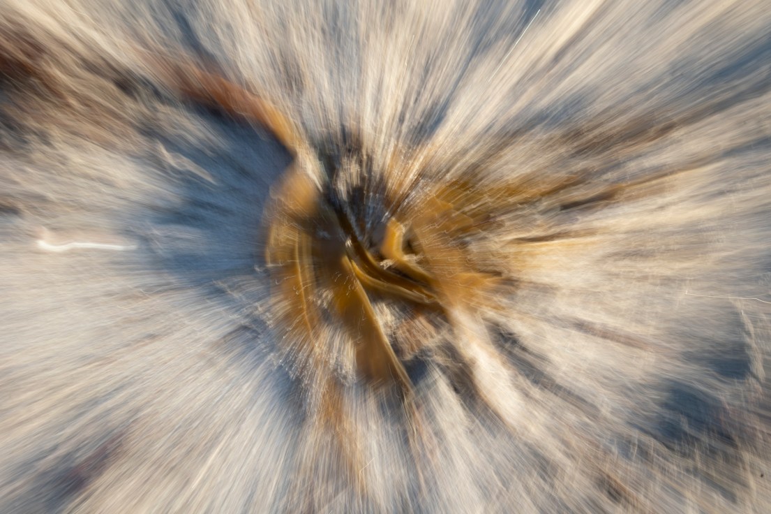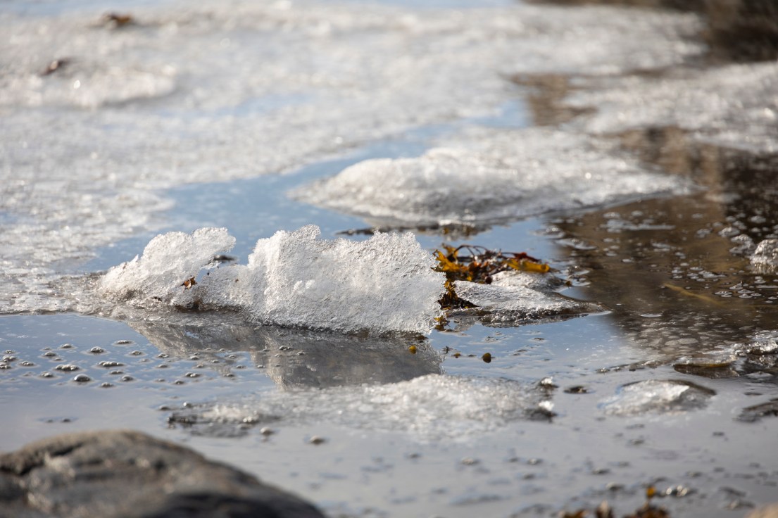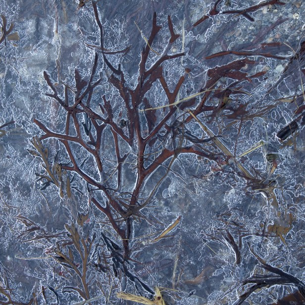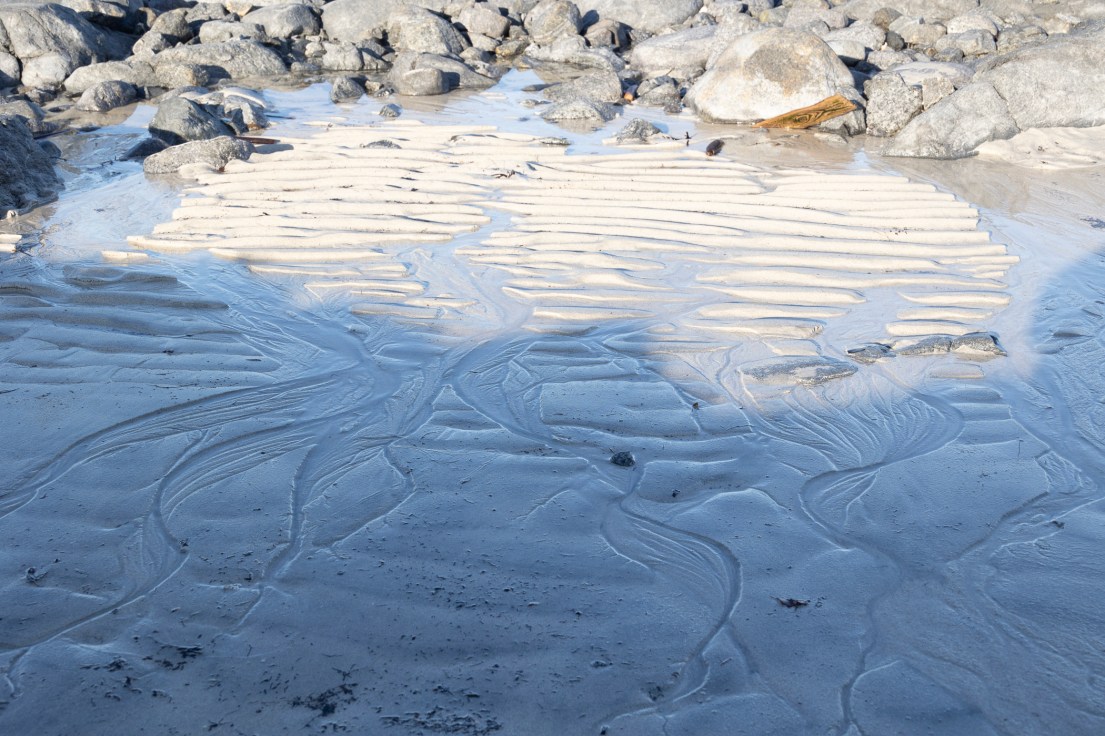 Toch best wel aangeslagen door dit nieuws, stapten we kort na het ontbijt wel weer in ons busje en gingen we naar “de Dam”, waar we het grootste deel van de dag zouden gaan doorbrengen. Aan alle kanten omringd door bergen, (deels) bevroren meren, zandstructuren, kelp, stenen en schelpen. Genoeg onderwerpen dus voor mooie foto’s. Vandaag werden we ook uitgedaagd om niet alleen “ansichtkaarten” te maken, maar ook creatieve foto’s, zoals bijvoorbeeld met ICM (intentional camera movement) of vanuit bijzondere standpunten. Voor de fotobespreking(en) was de opdracht 5 foto’s in te leveren, waarvan minimaal 2 creatieve. En natuurlijk stond de reisleider ons waar nodig bij met hulp en advies. Zelf begon ik met de “ansichtkaart”, die inmiddels nu bij mij in huis aan de muur prijkt 🙂 om me daarna te richten op zandstructuren en het alom aanwezige kelp. En ja, daar vond ik wel wat uitdagingen in om wat creatiefs mee te doen. Na de lunch (vanmorgen bij het ontbijt zelf klaargemaakt), stak ik over naar de andere kant van de Dam, om daar ook eerst weer de mooie omgeving vast te leggen. Ik kwam nu eenmaal voor de “ansichtkaarten” 😉 Maar ook hier kon ik me goed bezig houden en maakte ik, wat ik achteraf een van de leukste foto’s van deze reis vond.