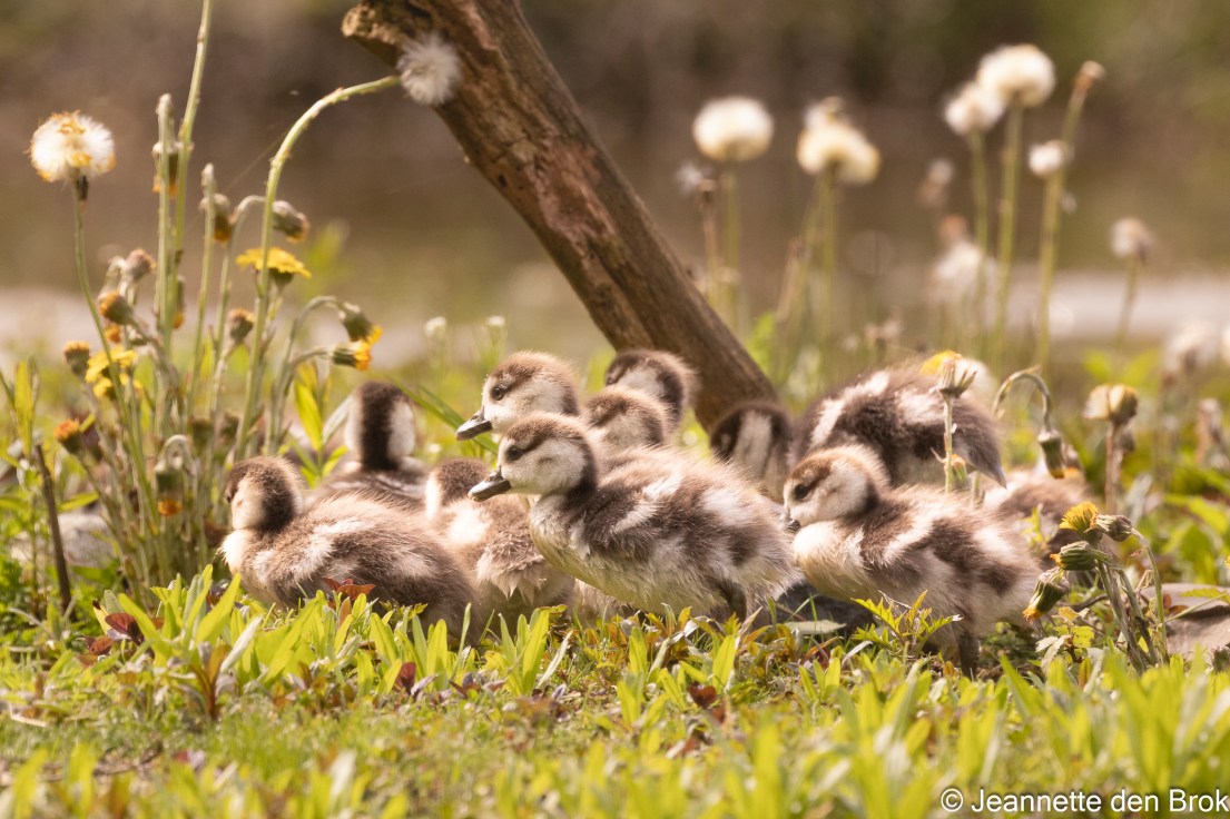 Een paar weken later, bij een bezoek aan een fotohut in Markelo zien we dat de Ganzen hun kroost al uitgebroed hebben en krijgen de pulletjes de eerste zwemlessen van de trotse ouders.