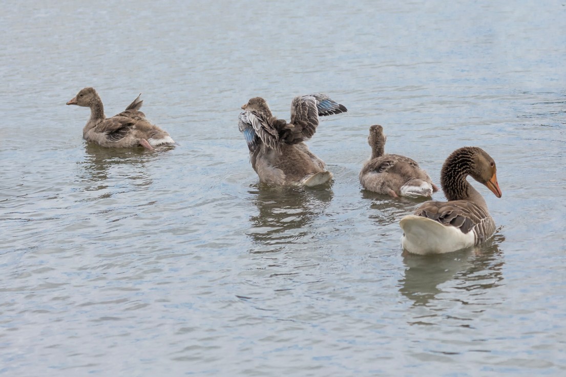 Verderop laag bij de grond, tussen uitbundig bloeiende planten scharrelden gezinnetjes Grauwe Ganzen rond, de jonkies kregen “zwemles” en andere gezinnen maakten een “uitstapje” over het eiland. En de Krakeend vond het weer wel goed voor een verfrissend bad.