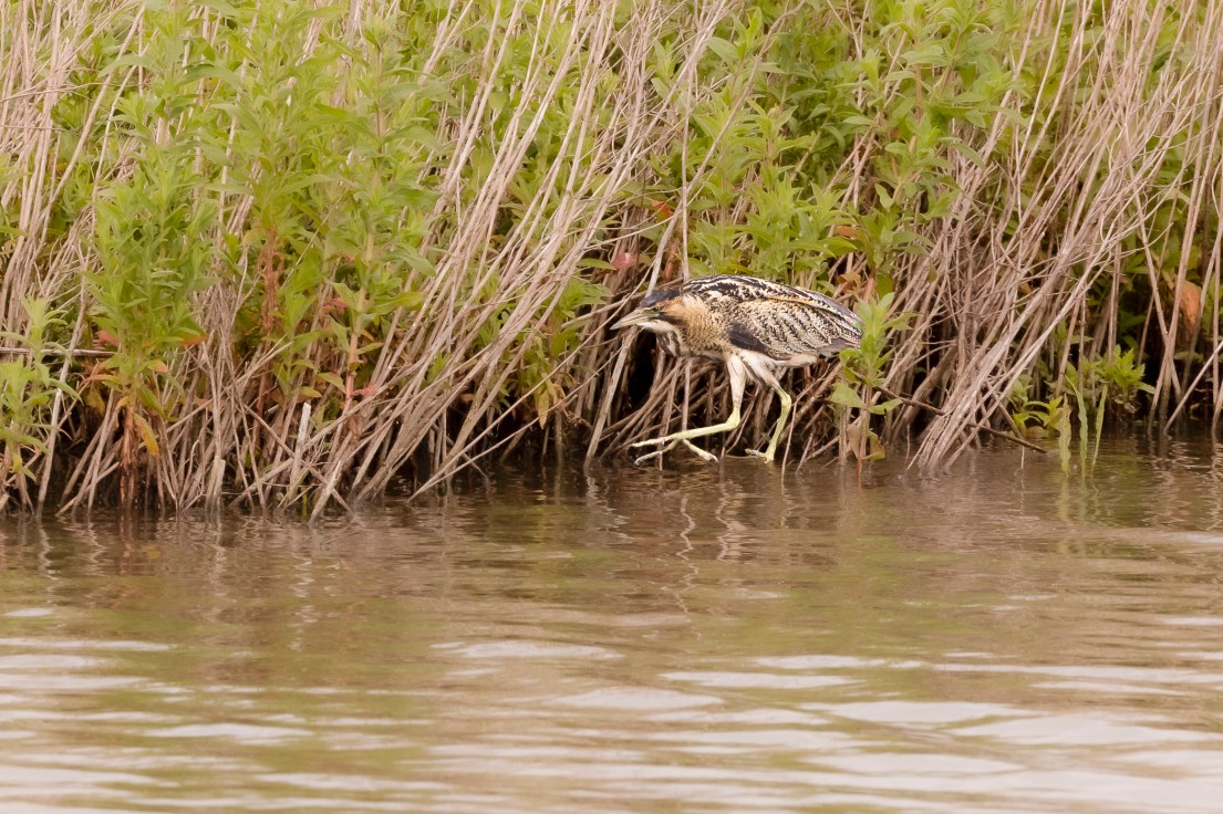 Aan de andere kant van het eiland hing de Rietgors aan een rietstengel te wuiven in de wind. Altijd leuk om te zien en ook deze zong vandaag uit volle borst zijn lied. Na deze uitgebreid bewonderd te hebben, besloot ik even een kijkje te nemen in een van de uitkijkhutten op het eiland. Ik loop naar binnen en zie gelijk een Roerdomp die aan de ene kant het riet uitkwam en het water overvloog naar de andere kant. Natuurlijk begin ik gelijk te fotograferen – de Roerdomp notabene ! Maar of ik nog een fatsoenlijke foto van hem heb voor die weer het riet inschoot dat moet ik thuis maar bekijken. Op het kleine schermpje van mijn camera kan ik de goed gecamoufleerde Roerdomp niet zo snel gevonden krijgen tussen het riet. Een mede IVN’er welke kort na mij ook deze hut binnen kwam, heeft het geluk deze bijzondere vogel vliegend vast te leggen. Maar ik ben bij thuiskomst, na de foto’s even snel doorgenomen te hebben ook al erg blij, want jawel hoor: de Roerdomp is duidelijk in beeld langs de rietkraag. Even een beetje croppen natuurlijk maar Yes, ik hem ‘m !