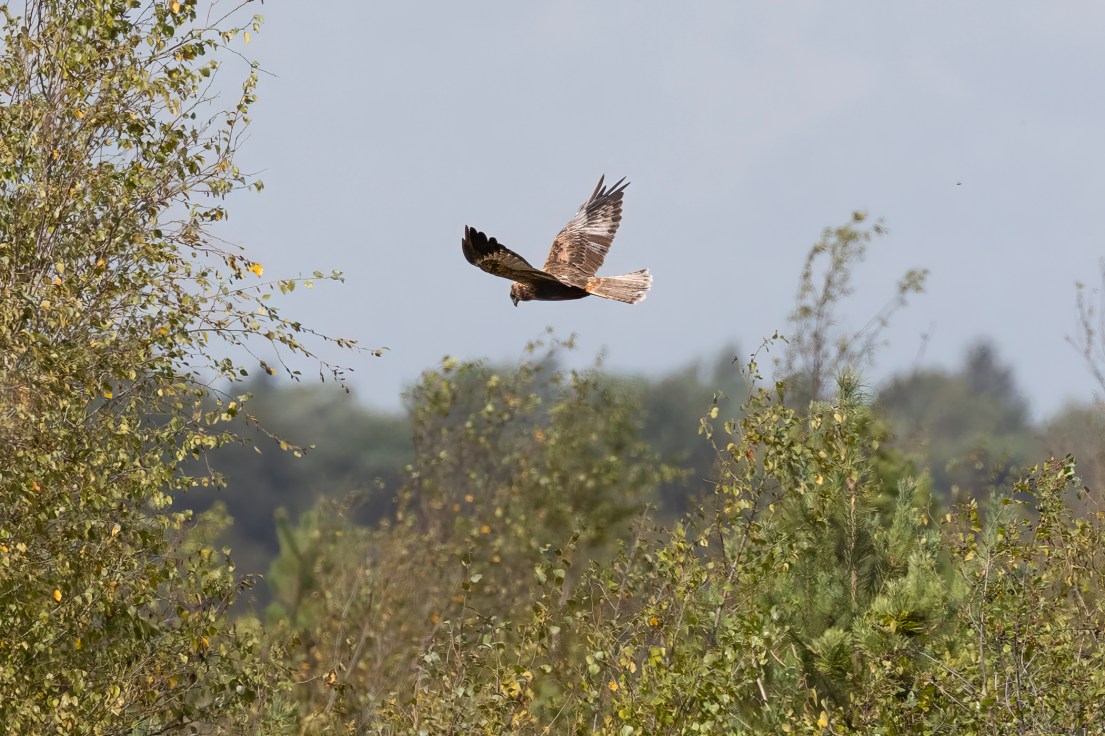 Na een tijdje besluit ik dus maar terug te gaan naar de camping om mijn auto op te halen en helemaal naar de andere kant van het park te rijden, waar een hele mooie wandelroute moet zijn die bovendien in de buurt komt van de vogelkijkwand Holtveen. De wandeling is inderdaad de moeite waard, maar ook hier wijk ik weer af van de route, want ik wil naar de kijkwand en nog een stuk verder, waar ik 2 jaar terug een veld vol Icarusblauwtjes aantrof. Ik was er toen wat eerder in het jaar, maar vanwege de relatief slechte zomer zijn vlinders dit jaar ook laat, dus wie weet heb ik geluk. Bij de vogelkijkwand zag ik op een behoorlijke afstand wat Wilde Eenden en een flink aantal Huiszwaluwen die over het water heen en weer scheerden. Jéé, wat zijn ze toch snel, foto’s maken is dan ook een hele uitdaging en ik bak er niet veel van. Maar als ik wat verder wandel zie ik daar iets groters rondvliegen. Zie ik dat goed, jawel hoor de Bruine Kiekendief is hier duidelijk op jacht ! Dat lukt wat beter ….