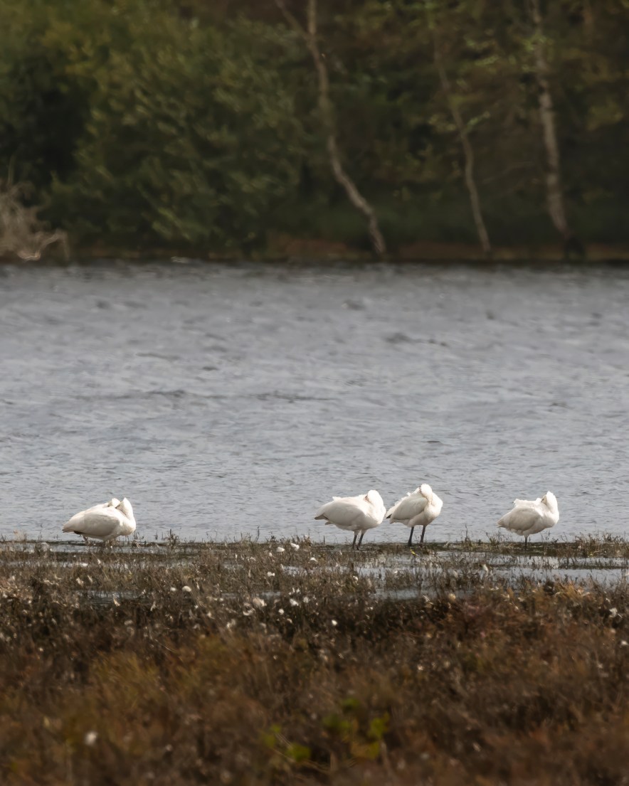 En dan volgt nog een verrassing op mijn wandeltocht; mijn oog valt op – weliswaar héél ver weg – een aantal Lepelaars aan de andere kant van een ven. De meesten in ruststand, maar enkelen zijn aan het fourageren. Na gepoogd te hebben met mijn 100-400 lens met 1.4 extender hier wat van te maken, ga ik toch eens proberen wat dichterbij te komen, maar helaas is dit gebied afgezet als rustgebied voor vogels. Jammer, maar waarschijnlijk wel nodig.