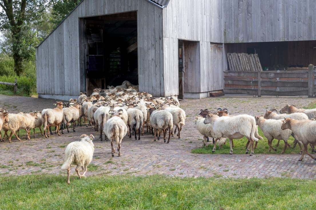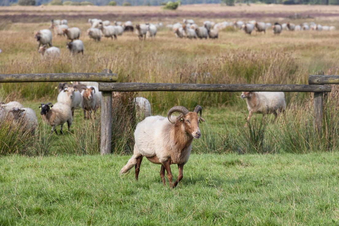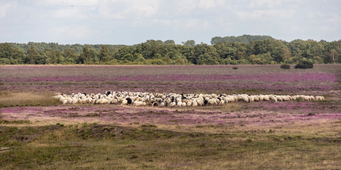 Een stukje verder kom ik een wat oudere dame tegen, die een probleem heeft om met haar rollator over het wildrooster te komen. Nadat ik haar geholpen heb raak ik met haar in gesprek en vertelt ze me dat om 5 uur de schaapskudde van Ruinen van de Heide terugkomt naar de Schaapskooi. Dat moet volgens haar een mooi tafereel zijn. Dus wandel ik terug naar mijn auto en ga op weg naar de parkeerplaats bij het bezoekerscentrum, vanwaar het niet heel ver lopen is naar die Schaapskooi. Het is intussen kwart voor 5 als ik daar aankom en inderdaad zie ik in de verte op de Heide de kudde al aankomen. Ik vraag me alleen af waar die kudde heen zal gaan om in de Schaapskooi te komen. Langs de achterkant ? Daar kun je als bezoeker niet bijkomen en bovendien is het daar ook niet echt mooi om foto’s te maken. Maar aan de voorkant ? Dat zou betekenen dat ze dwars door de intussen toegestroomde bezoekers heen moeten. Ik dacht dat schapen bang waren van mensen en dan juist de andere kant uit gaan. Maar blijkbaar is deze kudde zó aan mensen gewend dat hier totaal geen sprake van is, want volgens een andere bezoeker moet ik echt op het grasveld vóór de Schaapskooi gaan staan om te fotograferen en dan lopen de schapen zo om je heen. En inderdaad …. de uitgelaten schapen rennen bijna het laatste stukje dwars door alle bezoekers heen en worden vervolgens door de schaapshond vakkundig de Schaapskooi binnen geleid. Wat leuk om dat een keer mee te maken.