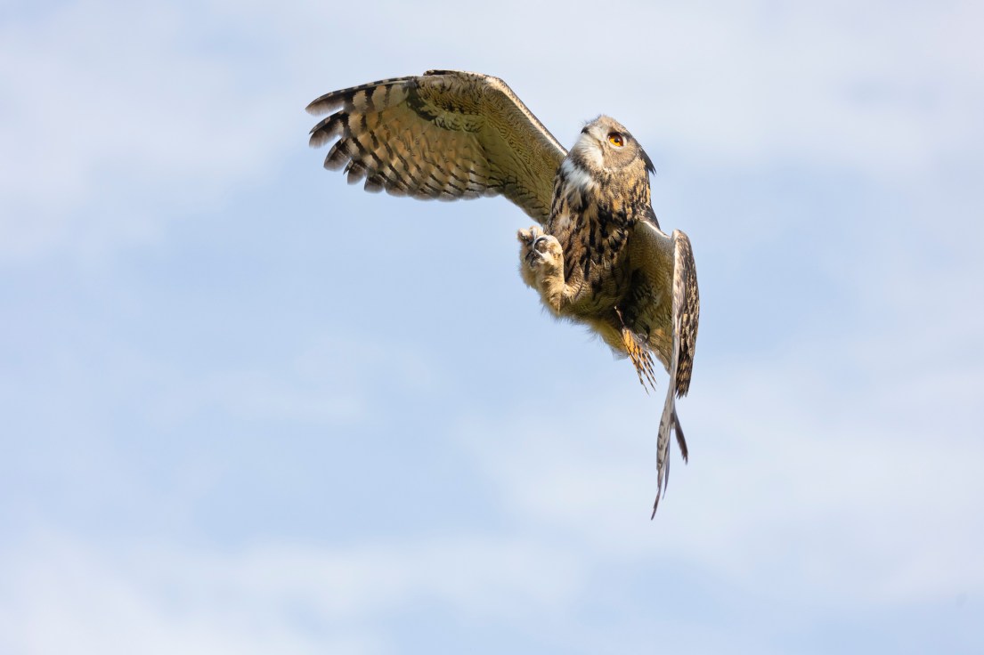 Voor de volgende vogel, de Europese Oehoe had ik niet echt de juiste positie ingenomen. Deze Uil vliegt van de paal af naar beneden, laag over de grond en dan bij de landplek weer omhoog, waardoor op veel van mijn foto’s de land-paal het zicht op de Uil belemmerde. Ook weer een lesje voor een volgende keer; let op je positie ! Maar ook bij deze Uil werd de prooi af en toe de lucht in gegooid, waarna de Oehoe er achteraan ging, wat tot bijzondere plaatjes leidde.