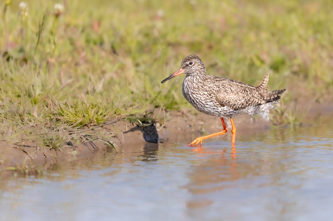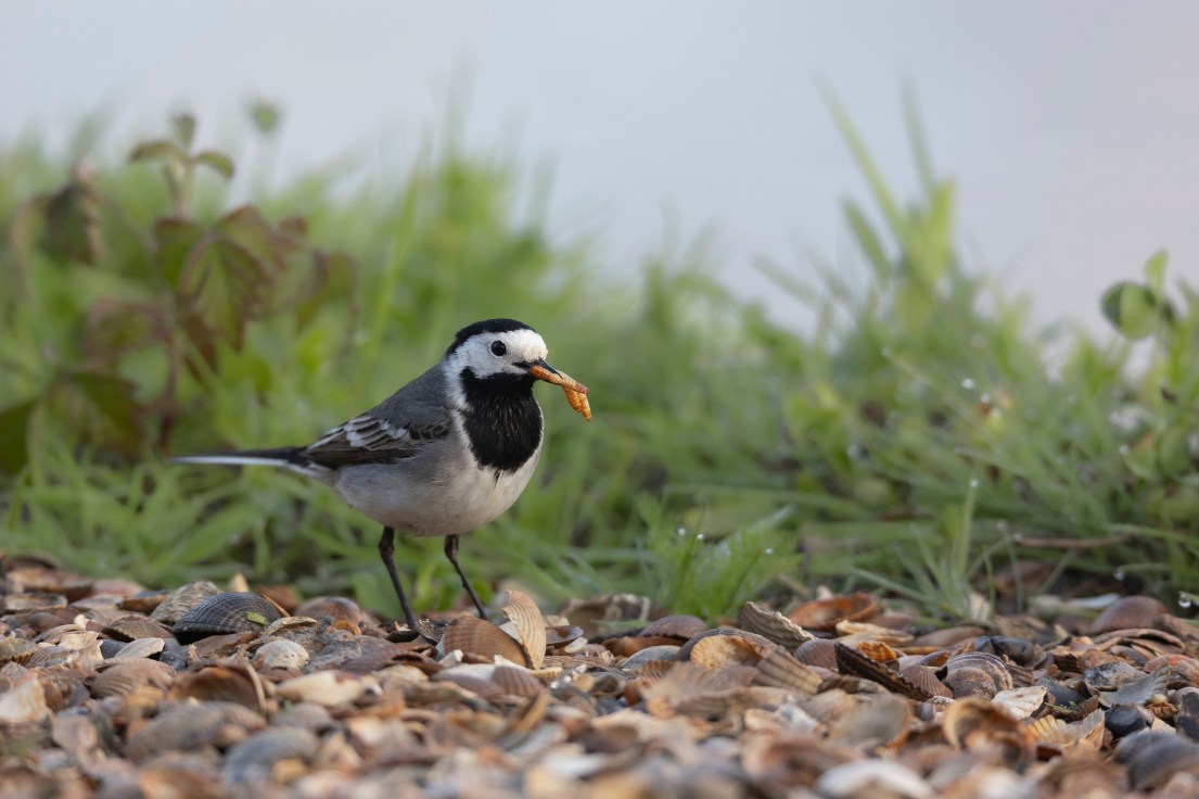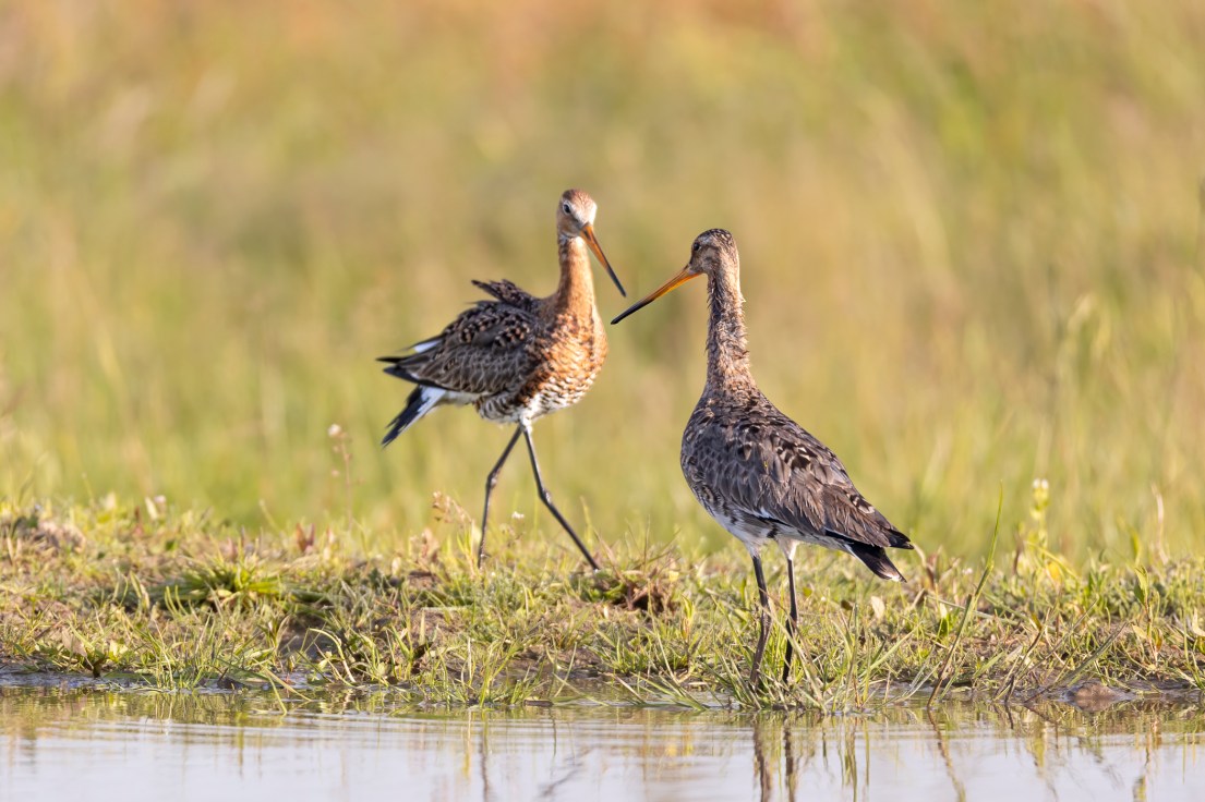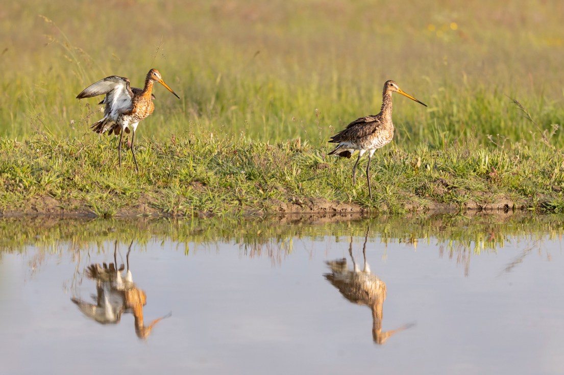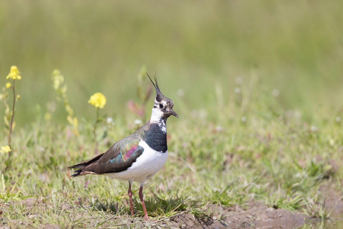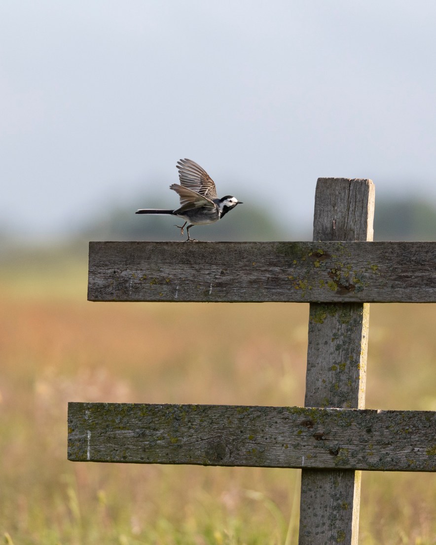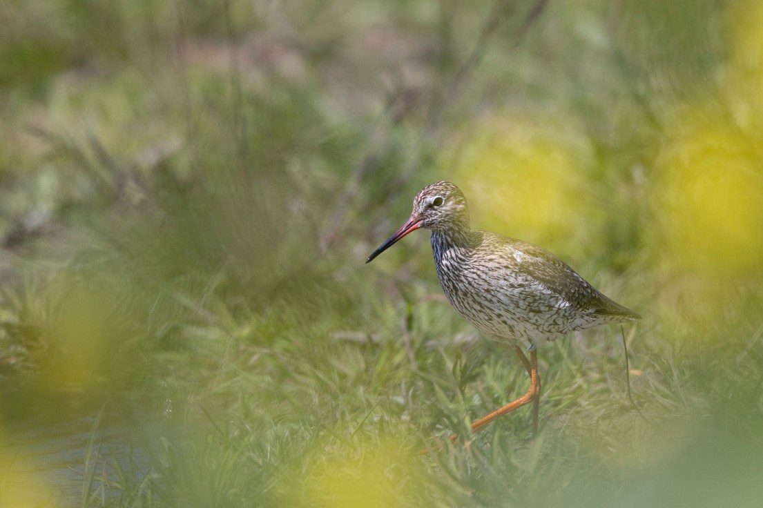 Om in de hut te komen moet je een eind door hoog gras lopen Hierdoor waren we ondanks onze regenlaarzen tot boven de knieën kleddernat. Maar het werd nadat de mist (die ‘s-morgens vroeg best hardnekkig leek) opgetrokken was een mooie en zonnige dag, dus we droogden vanzelf weer op. Wel stond er een stevige wind recht op de voorkant van de hut, waar je door openingen fotografeert. Dus bij tijd en wijlen toch best frisjes. Maar gelukkig trokken de vogels zich daar niet veel van aan. De hele dag vlogen ze af en aan. En het mooie van zo’n hut in een weiland is dat je er andere vogels ziet dan in een bos- of tuinhut. Reden dat we ook altijd zo graag naar Termunten gingen, omdat je daar ook ook totaal andere vogels ziet. Zijn het daar Wad- en Watervogels, hier dus juist Weidevogels – zoals de naam ook zegt 😉 zoals o.a. de Grutto, Tureluur en Kievit.