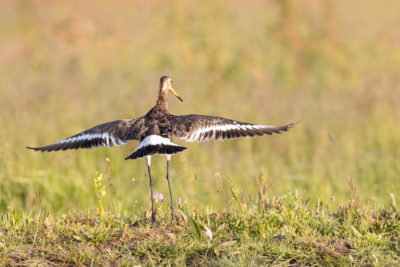 Om in de hut te komen moet je een eind door hoog gras lopen Hierdoor waren we ondanks onze regenlaarzen tot boven de knieën kleddernat. Maar het werd nadat de mist (die ‘s-morgens vroeg best hardnekkig leek) opgetrokken was een mooie en zonnige dag, dus we droogden vanzelf weer op. Wel stond er een stevige wind recht op de voorkant van de hut, waar je door openingen fotografeert. Dus bij tijd en wijlen toch best frisjes. Maar gelukkig trokken de vogels zich daar niet veel van aan. De hele dag vlogen ze af en aan. En het mooie van zo’n hut in een weiland is dat je er andere vogels ziet dan in een bos- of tuinhut. Reden dat we ook altijd zo graag naar Termunten gingen, omdat je daar ook ook totaal andere vogels ziet. Zijn het daar Wad- en Watervogels, hier dus juist Weidevogels – zoals de naam ook zegt 😉 zoals o.a. de Grutto, Tureluur en Kievit.