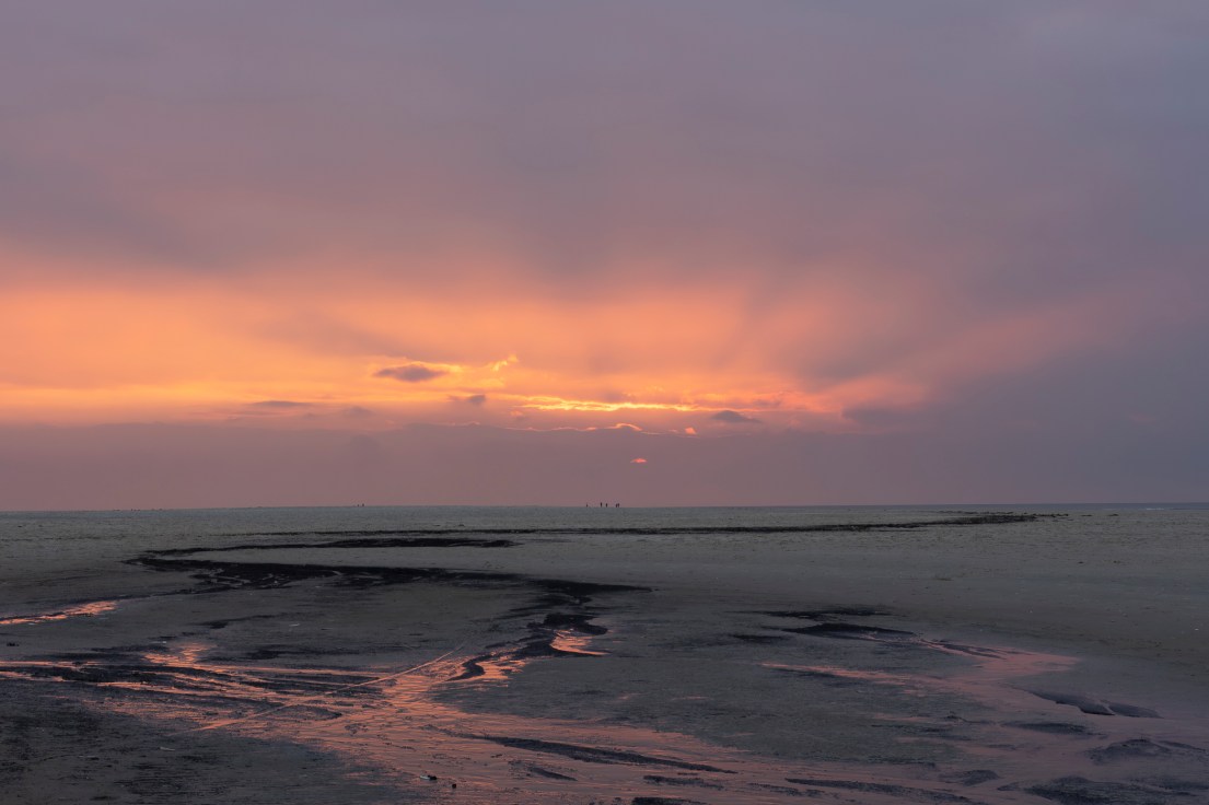Eind van de middag verlieten we deze “speeltuin” voor fotografen weer om in de Triaan aan te schuiven bij de avondmaaltijd, welke intussen door enkele achtergebleven reisgenoten was bereid. Na de maaltijd de camera-rugzakken weer inpakken en zorgen voor voldoende volle batterijen om weer op pad te gaan voor een hopelijk spectaculier mooie Zonsondergang. Hiervoor nam Jan Smit ons mee naar de noordelijkste punt van Texel. Een prachtig gebied, waar we ons eerst bezig konden houden met structuren en patronen in het zand, wachtende op die mooie Zonsondergang. In eerste instantie leek het ijdele hoop, maar “good things come to those who wait” en tegen de tijd dat de Zon zou verdwijnen achter de horizon gloorde er een roze gloed, om daarna langzaam de lucht in vuur en vlam te zetten ….